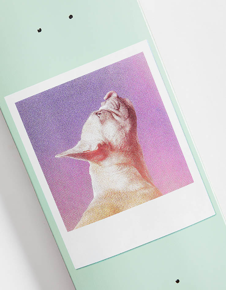 The Jart Instant Film Skateboard Deck is a team board coming in at 8.25" wide. The deck features a polaroid of a dog on a light green background.