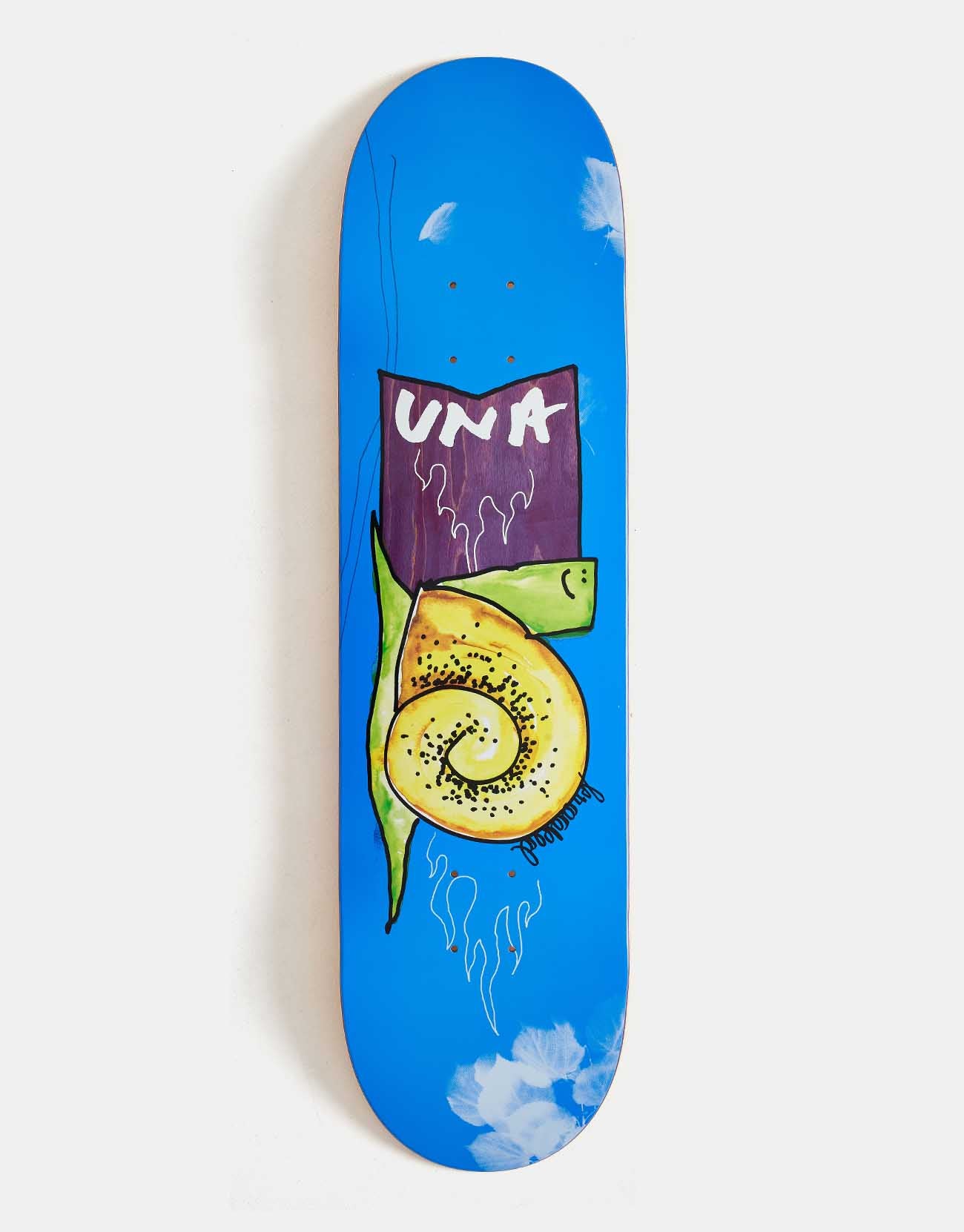 The Krooked Una Flame Snail Skateboard Deck is a pro model for Una Farrar coming in at 8.25" wide. The deck features a little snail zooming across a blue background.