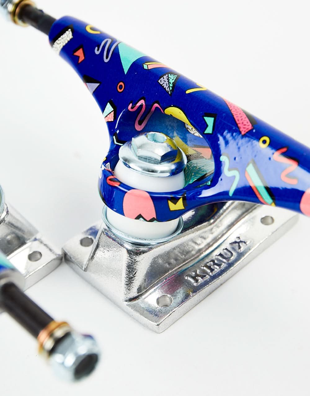 The 90s trucks from Krux feature a polished baseplate with a blue hanger covered in fun patterns and shapes. This truck has the DLK (Down Low Kingpin) for less hang up and more dip on them smiths.