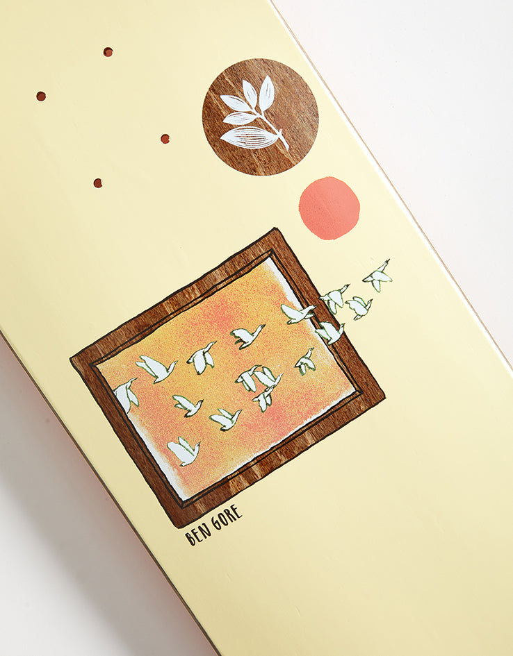 The Magenta Gore Solstice Skateboard Deck comes in at 8.4" wide and is a pro model for Ben Gore. Featuring a drawing by Soy Panday, the graphic sees a flock of birds flying into the board through a window on a cream background. Magenta branding sits above the bottom bolts and the logo is seen to the right of the top bolts.