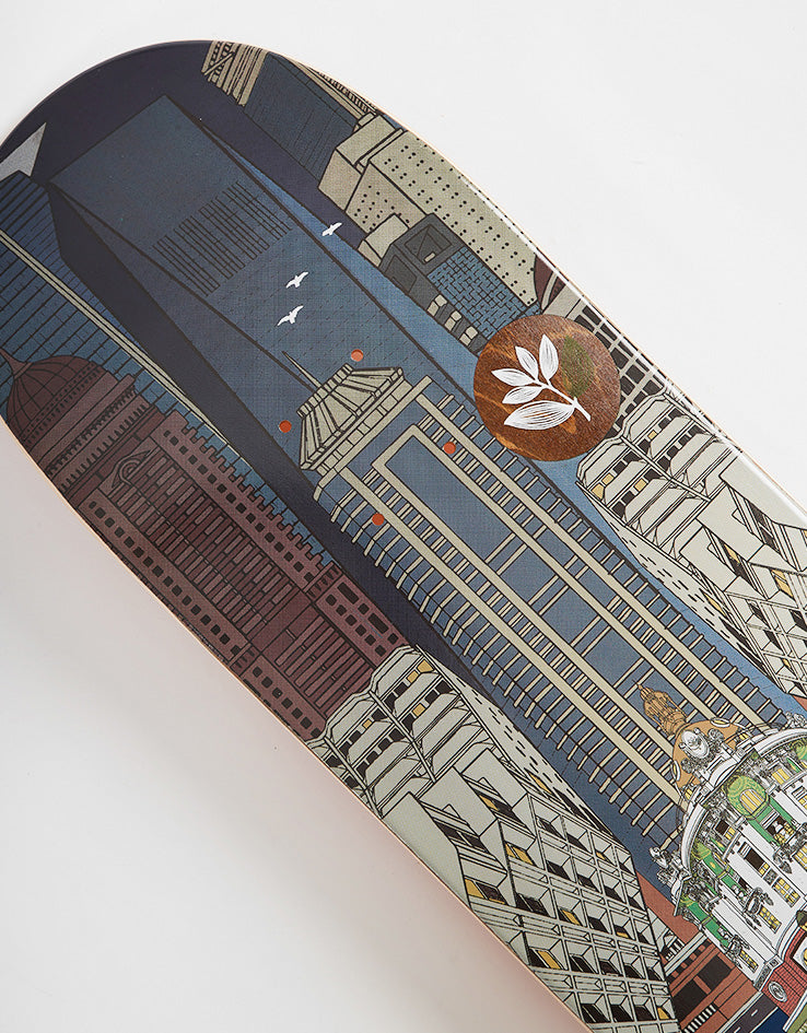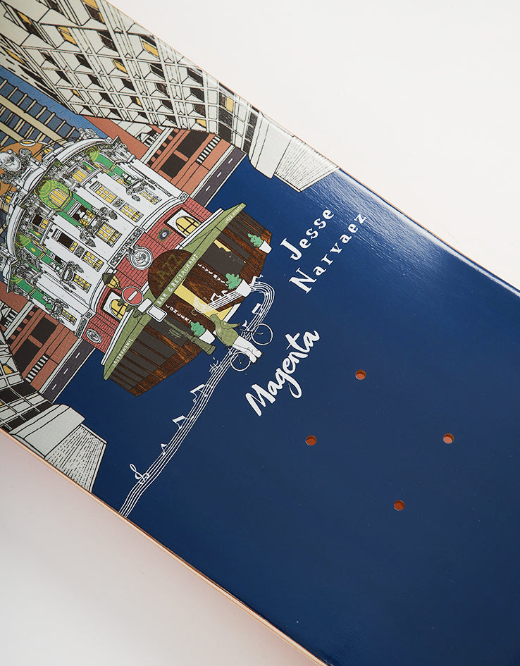 The Parisian board masters help us get into full swing this autumn with Magenta’s Fall City Jazz Series. With soothing scenes depicting cityscapes, bustling bars and jam sessions in Soy Panday’s characteristically evocative art style. The Magenta Narvaez City Jazz Skateboard Deck is a debut pro model for Jesse Narvaez coming in at 8.4" wide. The deck features a jazz bar in the midst of a bustling cityscape, with Magenta branding to the right of the top bolts.