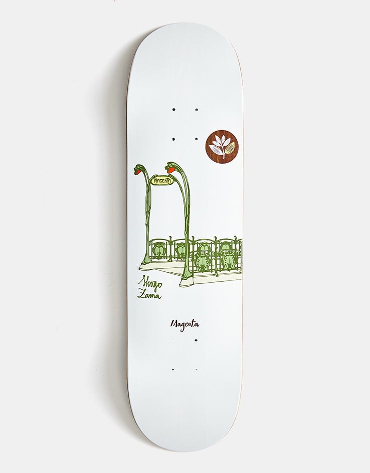 The Magenta Zama Relic Series Skateboard Deck is a pro model for Shogo Zama coming in at 8.4" wide. The deck features an illustration of an art nouveau inspired metro stop on a white background.