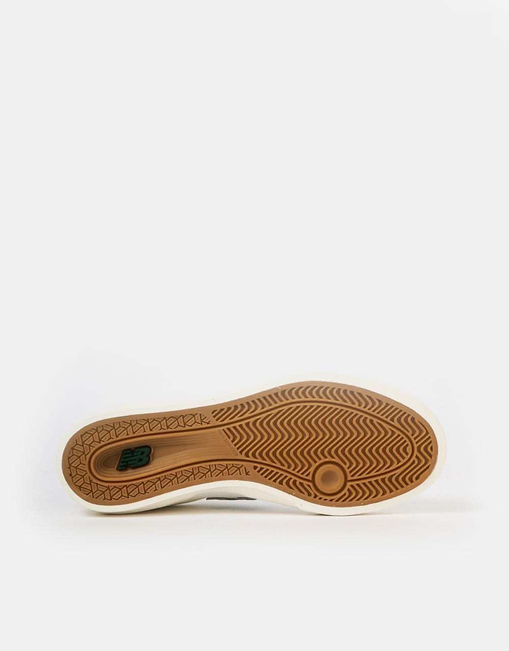 The New Balance Numeric 272 Skate Shoes in White/Green are ideal mens skate shoes designed for both casual wear and skating. Fully vulcanised, these skate trainers feature a reinforced one-piece toe panel and a lightweight leather/mesh upper that enhances boardfeel and mobility. Rubber overlays on the lower heel prevent abrasion, while the upper heel boasts a green leather tab. Reflective panels on the heel and tongue, along with 'N' logo branding on the midfoot, add style. The breathable interior lining and perforations across the toebox make these New Balance skate shoes perfect for any skater.