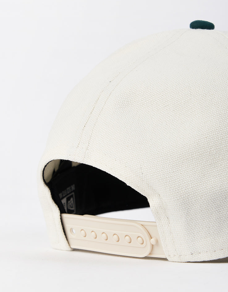 The New Era Oakland Athletics Script PC Golfer Snapback Cap features an ivory front with dark green accents, showcasing the iconic Athletics script logo prominently on the front. Made from high-quality materials, this cap offers a comfortable fit and a stylish, sporty look. Its snapback design allows for adjustable sizing, making it perfect for casual wear or supporting your team in style.