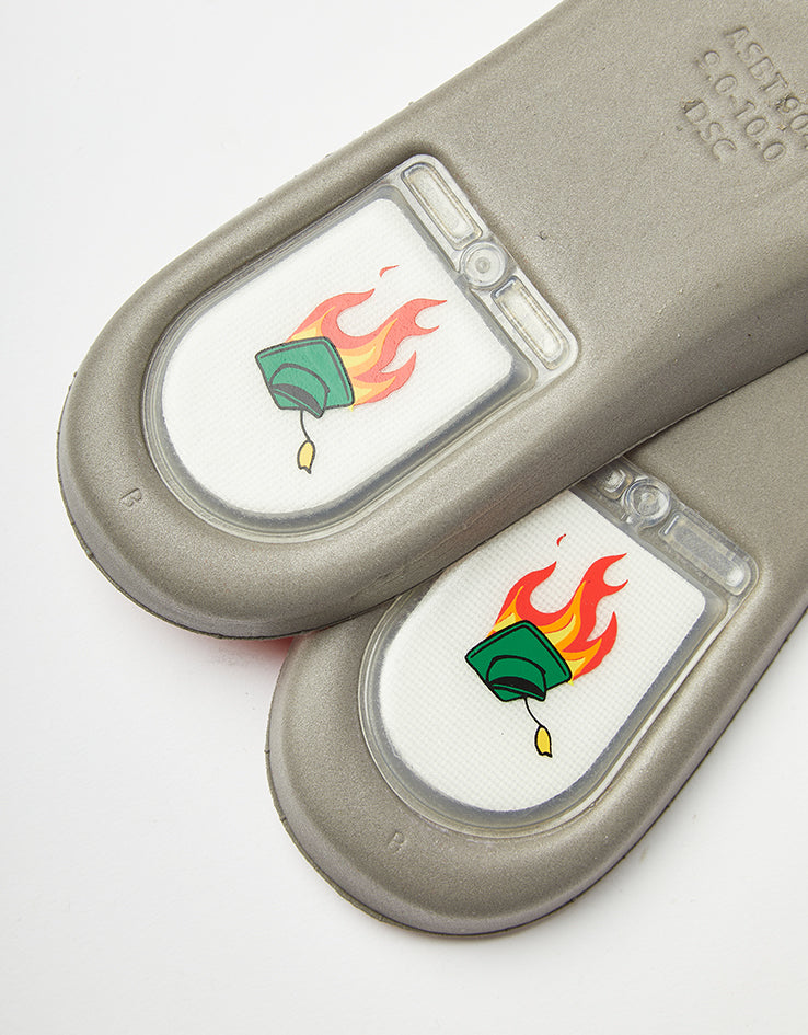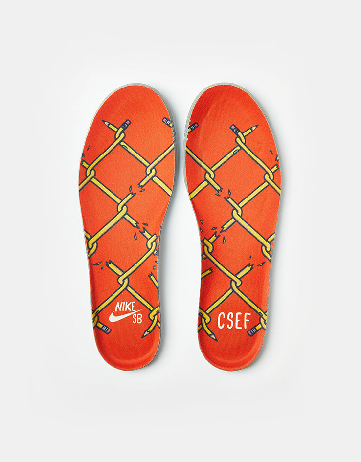 The homages to academia run plentiful throughout the shoe, with a debossed studious skateboarder illustration, Scantron answer sheet tongue tab on the slimmer tongue, and the shoe graduates with a ceremonial CSEF tassle. To round out the shoe with first-class honours, a skate-away “eraser” pink hides under the whiteboard overlays.