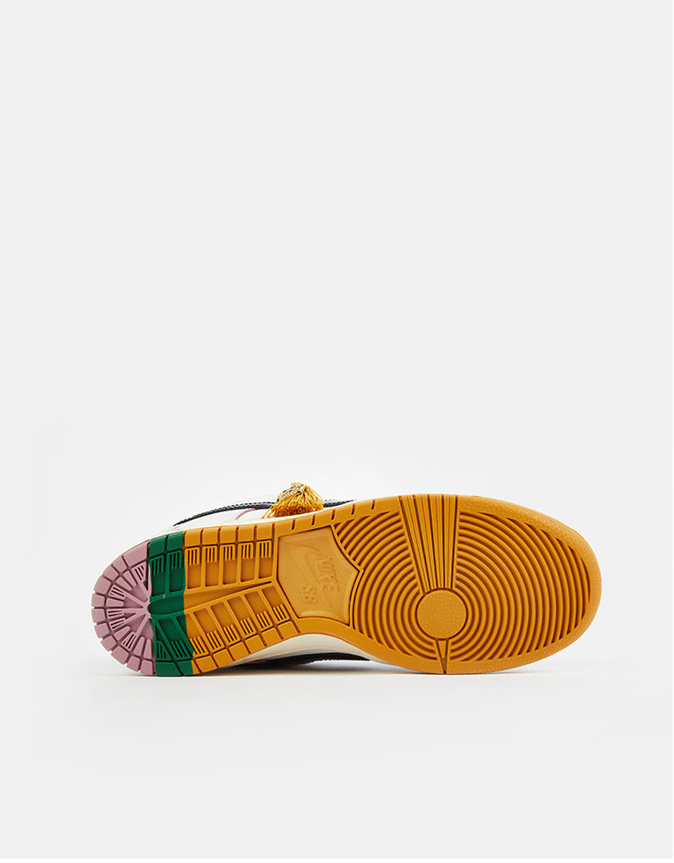 The CSEF Dunk’s commencement starts with a white leather upper inspired by the whiteboards found in classrooms across the world. Contrasting black and grey suede accents are found on the perforated toebox and upper heel, along with a patent leather swoosh. CSEF’s signature yellow and green are found on the lining and heel tab, with the latter hosting mismatch collegiate Nike and CSEF heel tab branding. Underfoot, a tricolour arrangement adorns the outsole and graphic sockliners sit inside.