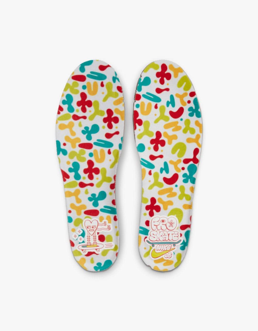 ā€œAll Love, No Hate" is the message driving the new Nike SB collaboration with froSkate. The tongue graphics, heart-shaped perforations, and embossed sides remind you that everyone is welcome in the skating community while the eye-catching upper and soles pay homage to the fun, vibrant makeup of the froSkate crew!