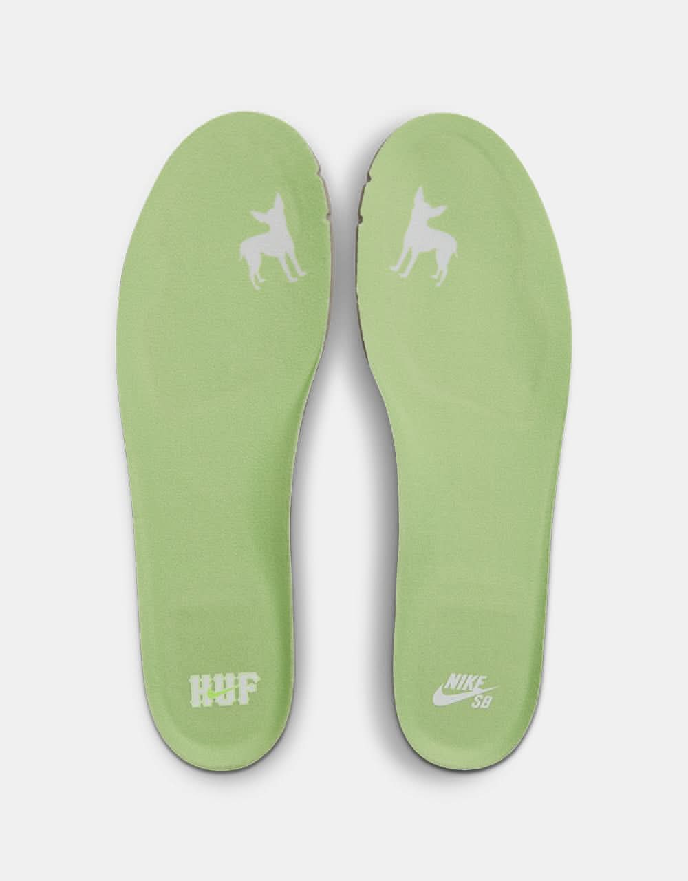 On the topic of silhouettes, the HUF x Nike SB Dunk Low gets the extra special honour of using a last from the first days of the SB Dunk, a rare opportunity only afforded to the companies who collaborated with Nike SB right at the very beginning. The shoe is finished with a nylon tongue, harking back to the original Dunk and Air Jordan models that were adopted by skateboarders during the period that Huf grew up skating.