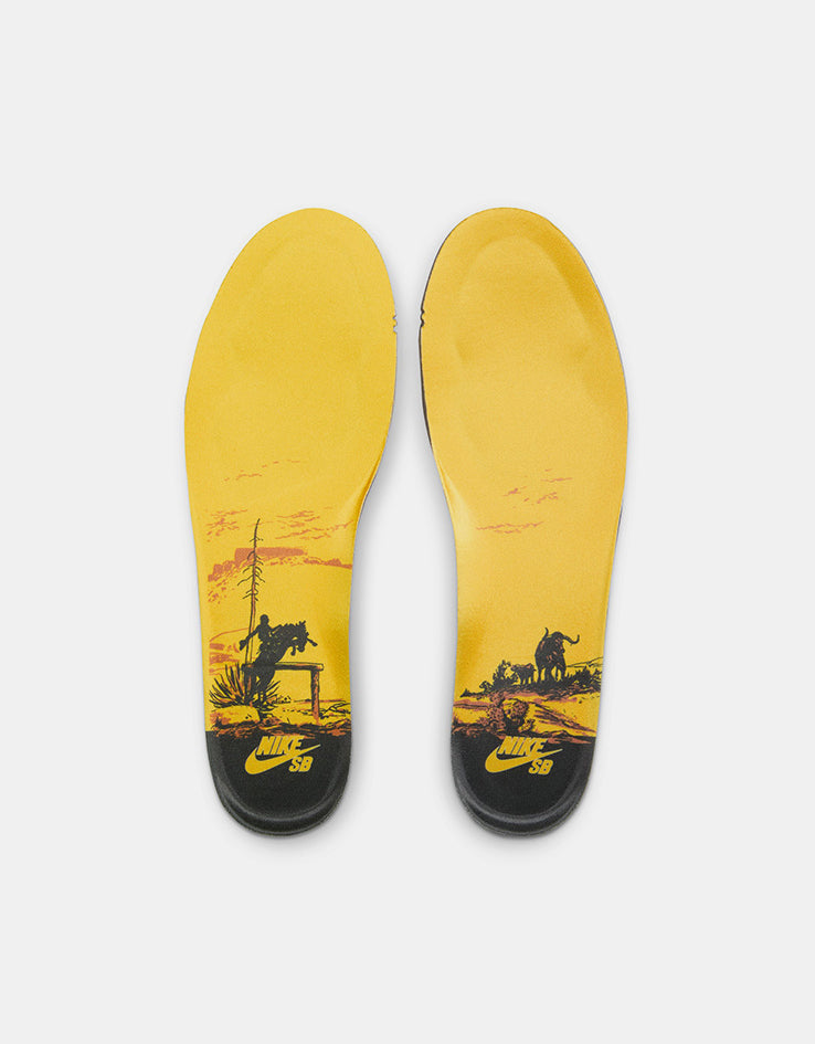 The finer details found throughout the Dunk are a compelling homage to the rich cultural history of cowboys, ranchers and Western folklore. Adorned on the heel counter, an ostentatious display of thread work, reminiscent of the finest boots in the West. Matching cracked leather heel and tongue tabs evoke the rawness of Western life, whilst the red threading gives Nike SB branding pride of place. The upper is finished with a golden yellow lining on the collar and tongue.