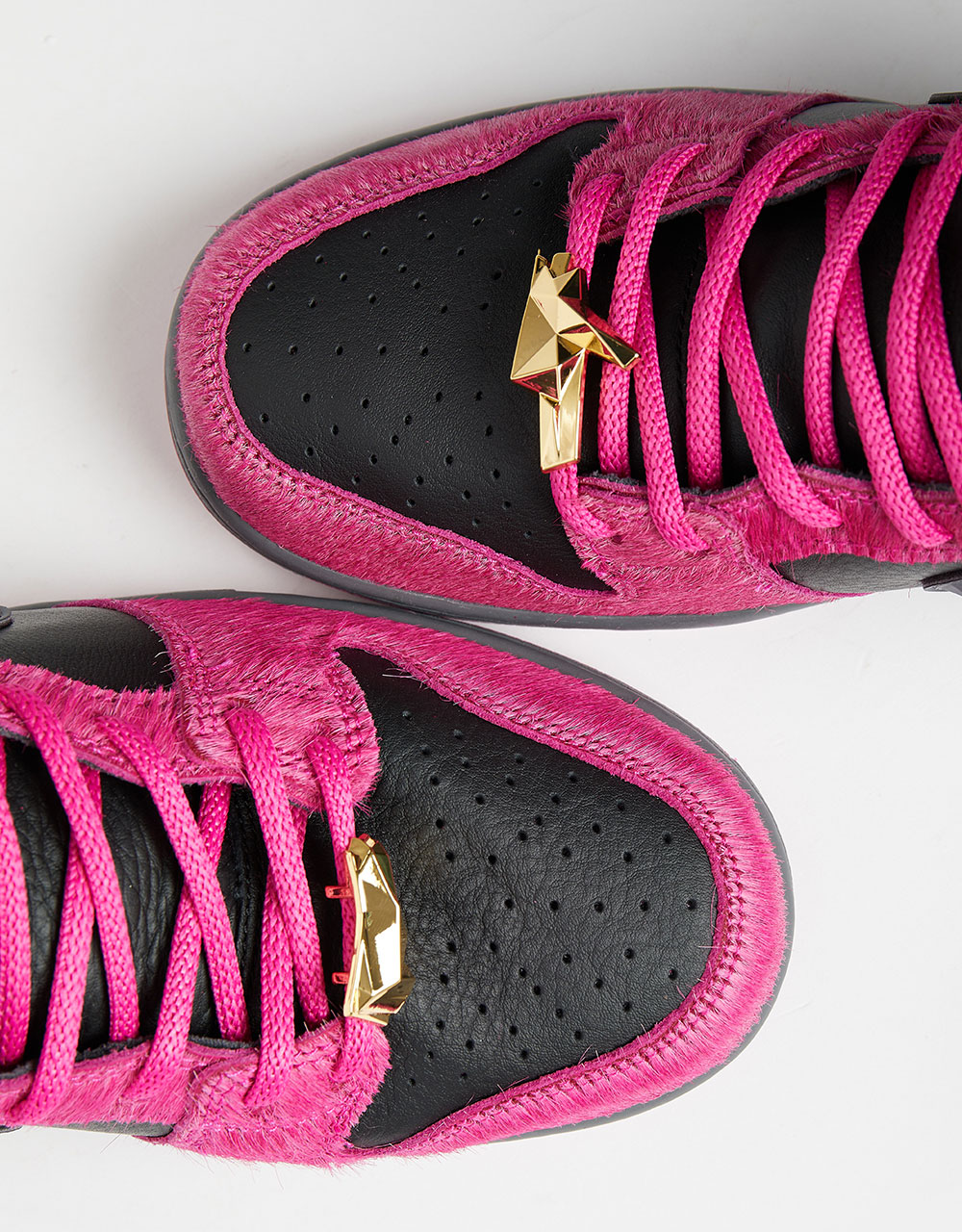 When Killer Mike said “my Nike pendant sacred, similar to the Ghostface bracelet” on walking in the snow, he might have spoken the Run The Jewels x Nike SB Dunk High into existence. This self-assured shoe takes its cue from Run The Jewels’ most recent work, RTJ4, and sports statement textiles fit for the stage. The Active Pink / Black colourway creates an immediately captivating contrast, amplified by faux pony hair panelling that distinguishes this Dunk from any other and settles over a rich leather foundation; gold Run The Jewels logo embellishments perch over the base of the laces, embodying hip hop’s obsession with opulence, mimicked by the chiselled leather swoosh; a black midsole and vibrant pink outsole touch the ground below, and, out of sight, custom logo insoles can be found in the footbed.