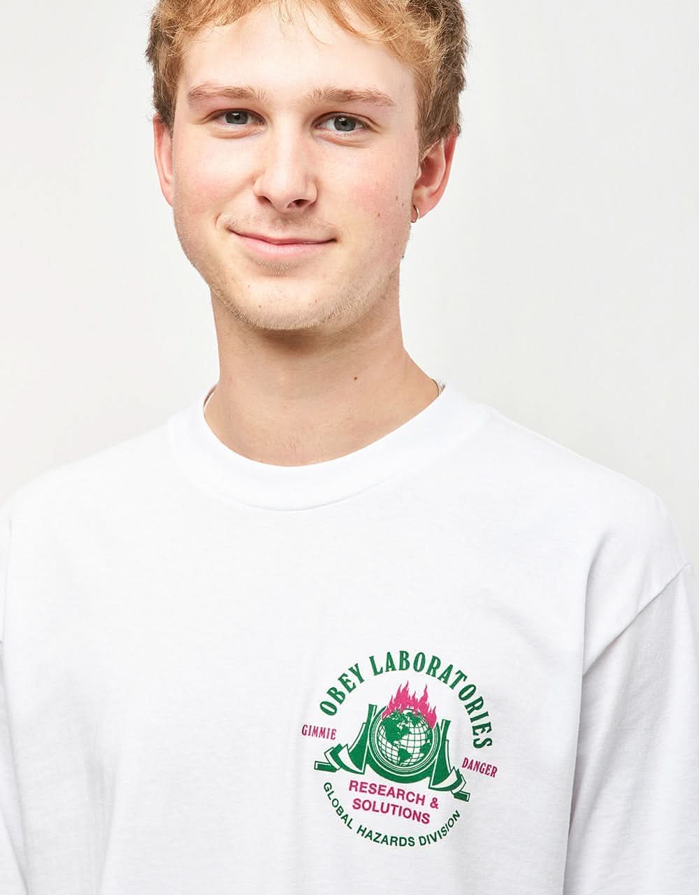 Obey presents their Laboratories T-Shirt in White, featuring screen printed graphics on the front and back, in bright green and red. Crafted from 100% cotton and styled in a regular crewneck fit, this is an essential addition to the wardrobe.