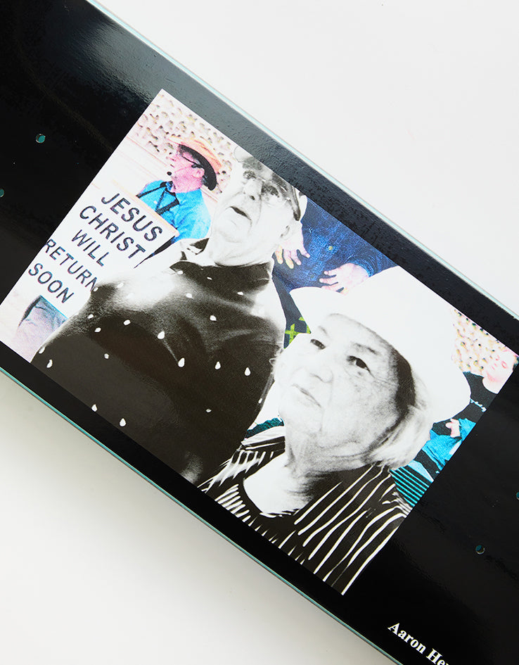 The Return Soon board for Aaron Herrington features a collage photo in the centre of the deck with a flat, black background. Aaron's name is printed under the back mounting holes.