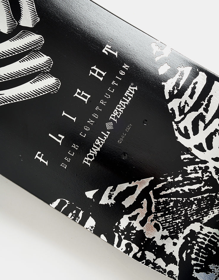 The Powell Peralta Skeleton Foil FLIGHT K26 243 Skateboard Deck is a team board coming in at 8.25" wide. The deck features a skeletal silver foil design on a black background. A FLIGHT™ deck, delivering a thinner, stronger, and longer lasting deck than your standard board construction.