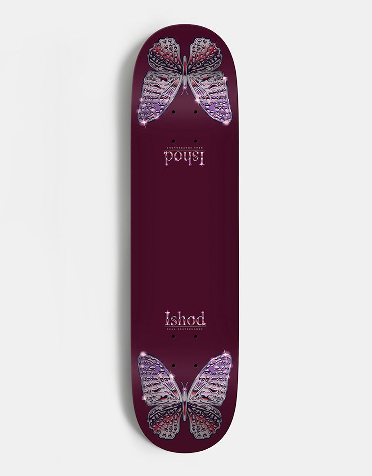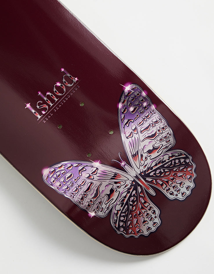 The Real Ishod Mariposa Chrome Redux TWIN TAIL Skateboard Deck comes in at 8" wide on a burgundy background.