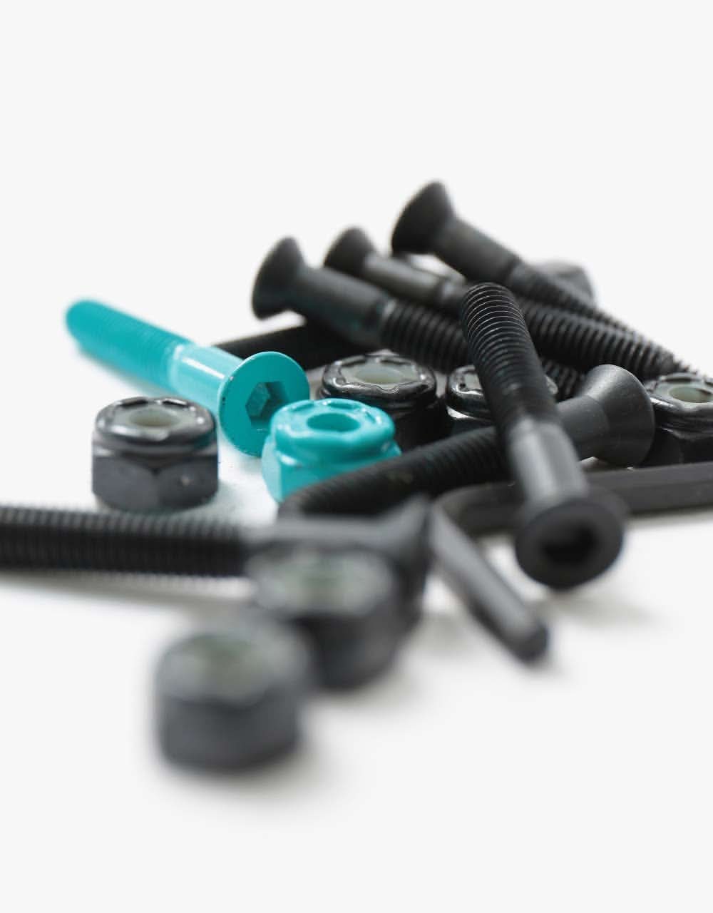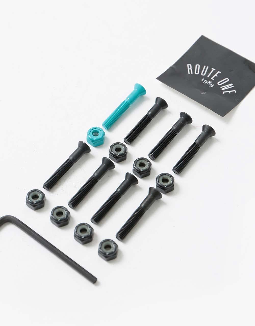 The Route One 1 1/4" Allen Bolts feature one Teal bolt to help you identify your nose from your tail. These are Premium, no fuss hardware, guaranteed to hold. These bolts are designed to be used with a 1/8" or 1/4" Riser Pad.