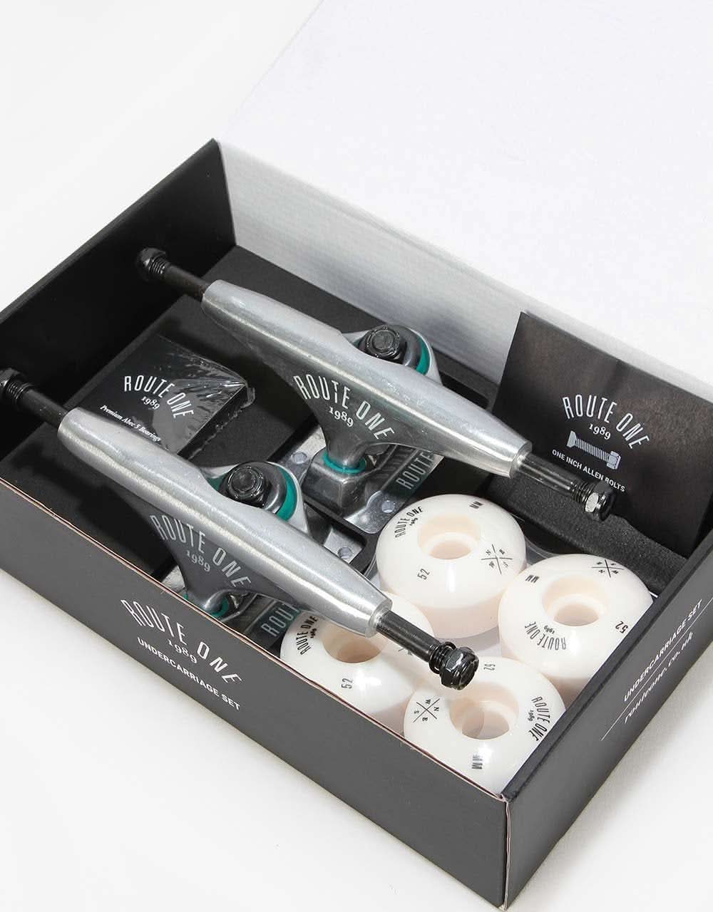 The Route One 5.375 Undercarriage Kit is everything you need to build your complete set-up, minus the deck! This handy kit comes with one set of Route One low team trucks, four 52mm Route One wheels, a set of 1" allen bolts and a set of premium Abec 5 bearings.