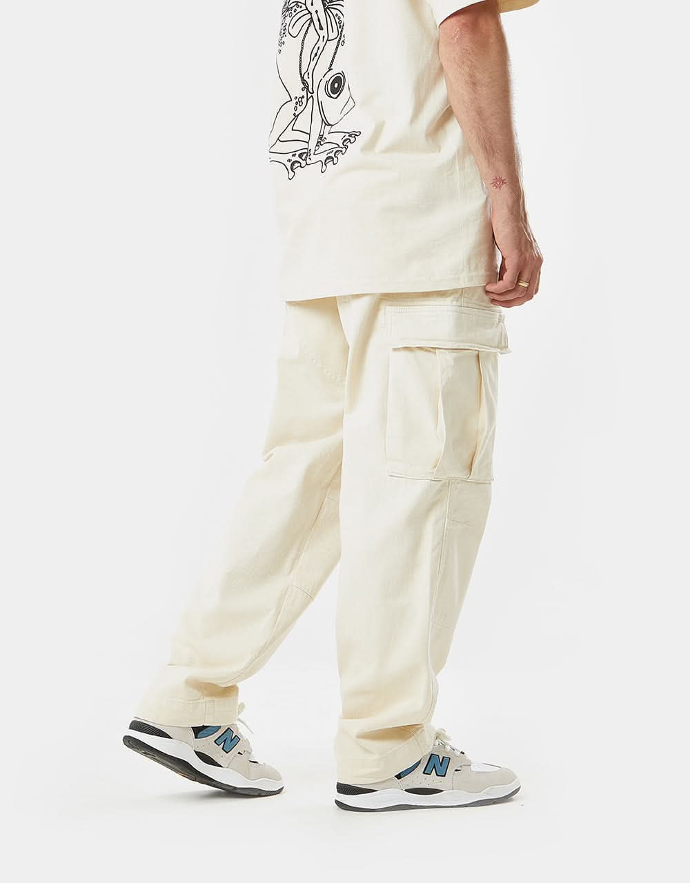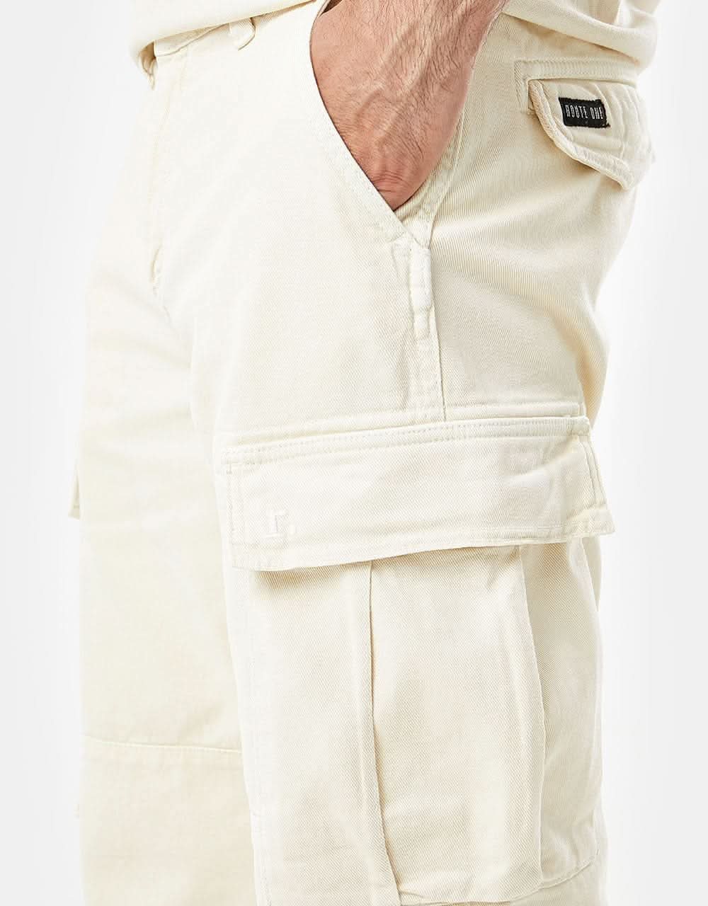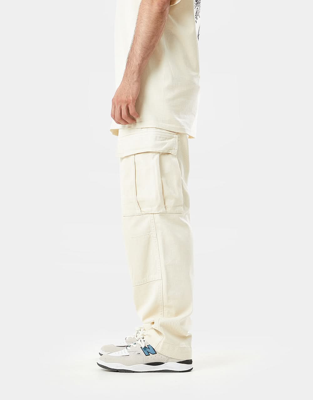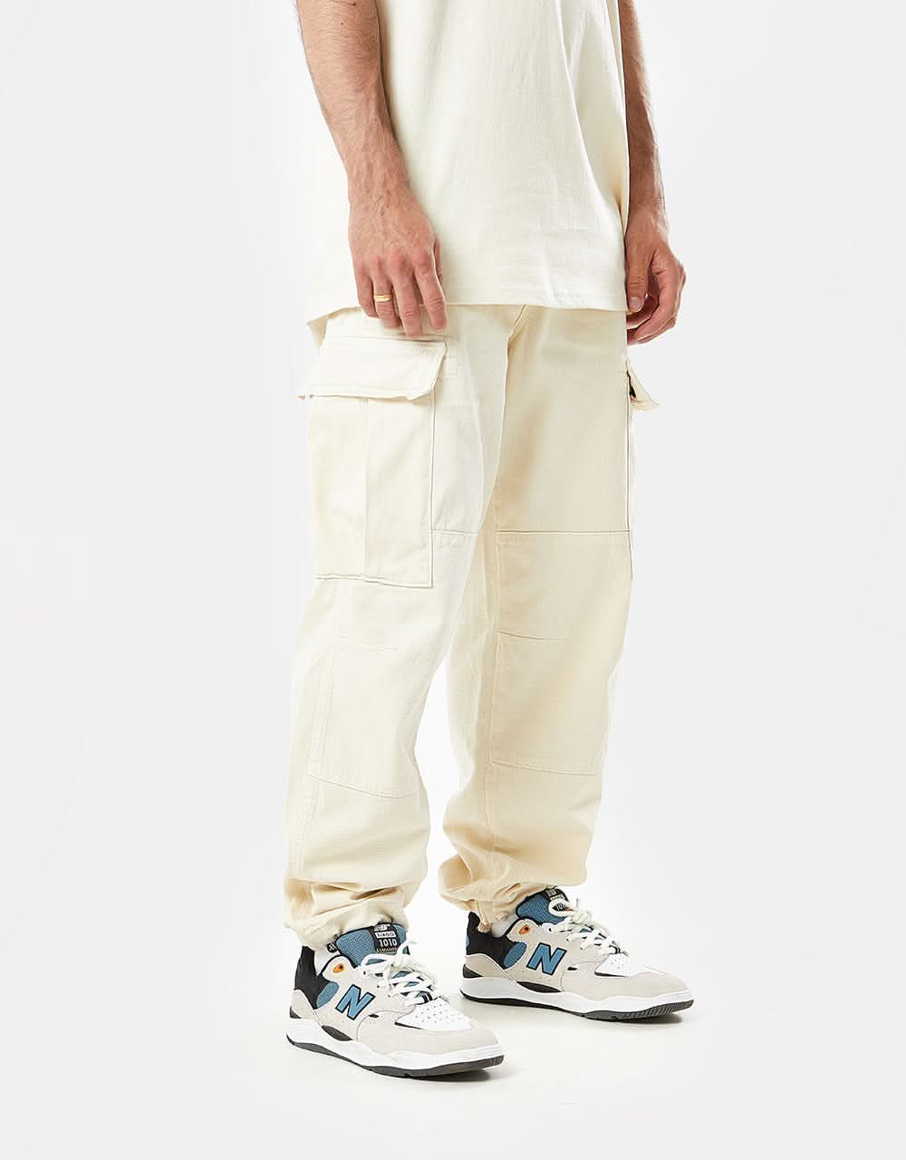 The Route One Classic Cargo Pants in Stone have been designed to be durable, comfortable and practical, perfect for whatever task you want to throw at them. Constructed from heavyweight 100% cotton twill, these loose fitting 6 pocket trousers are reinforced in all the right areas, with stitch detailing and bar tacks for durability. Pleated knee panels and popper pocket fastenings at the rear and sides complete the look, while the coin pocket and key chain loop add the final touches. Worn rolled up, down, or tightened with the pull cords, these super versatile cargos just can’t be beaten.