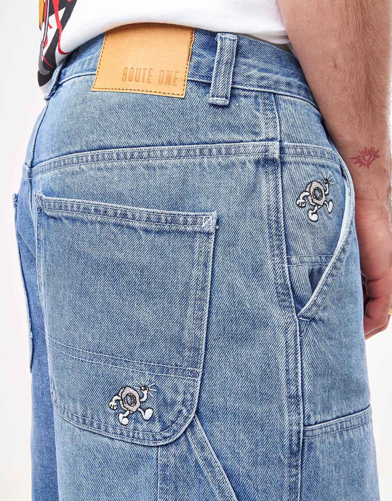 Introducing the Route One Super Baggy Double Knee Denim Shorts Washed Blue. These blue jorts are based on the Original Super Baggy Short with reinforced, double-layer knees, tool pockets, and a hammer loop. Made from a heavy-duty 13oz 100% cotton fabric and come in an oversized baggy fit. They feature a coin and back pocket embroidery detail, designed here at the Route One HO!