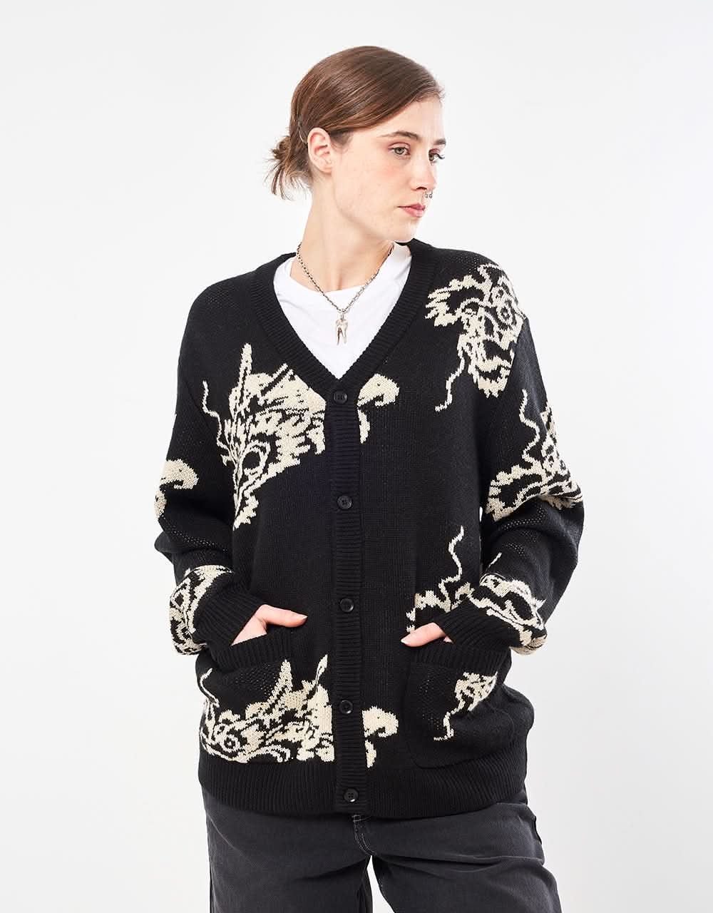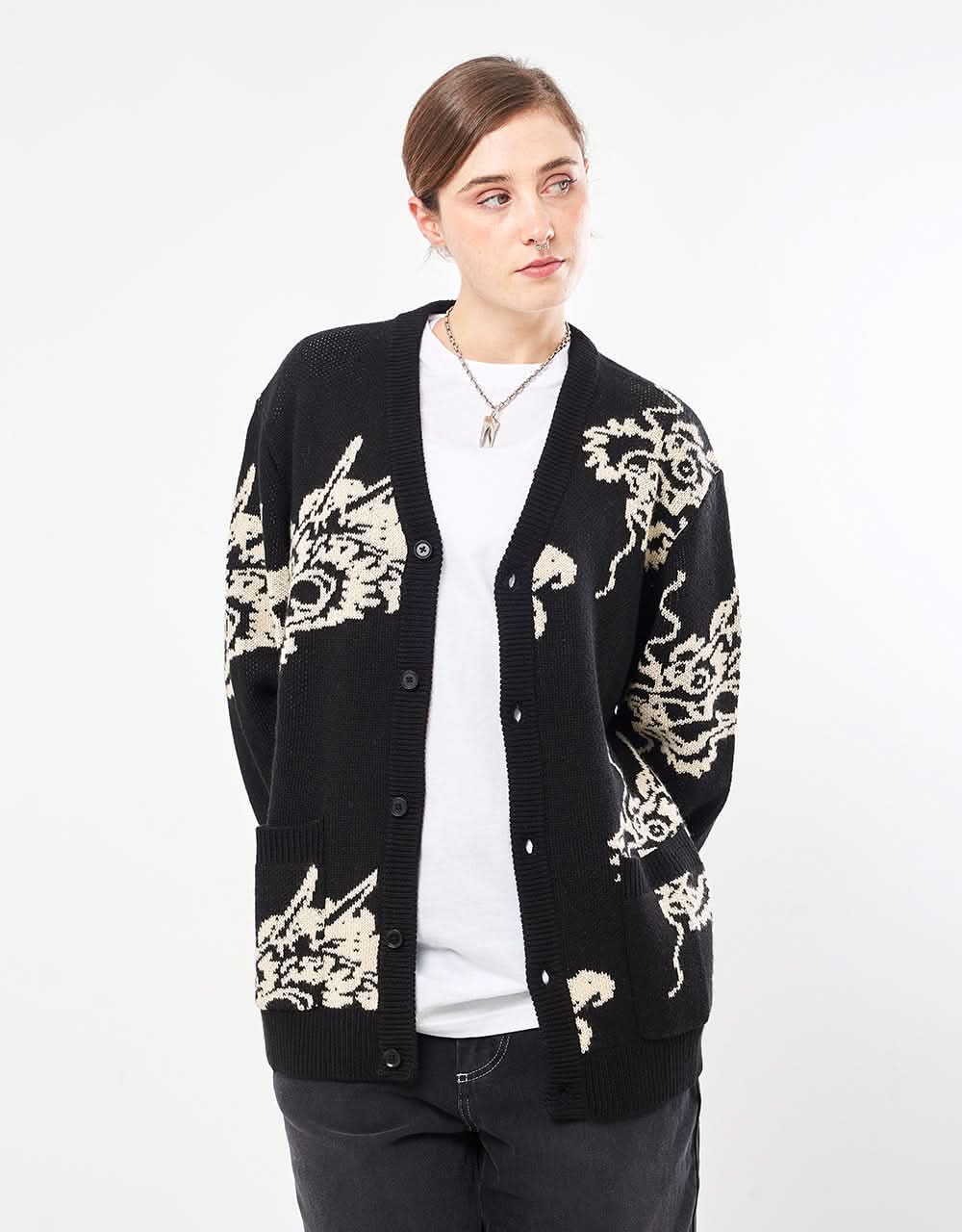 The Route One Dragon Knitted Cardigan is carefully crafted with a heavyweight Acrylic and Wool blend yarn and cut to a modern, slouchy fit that places itchy knitwear firmly in the past.