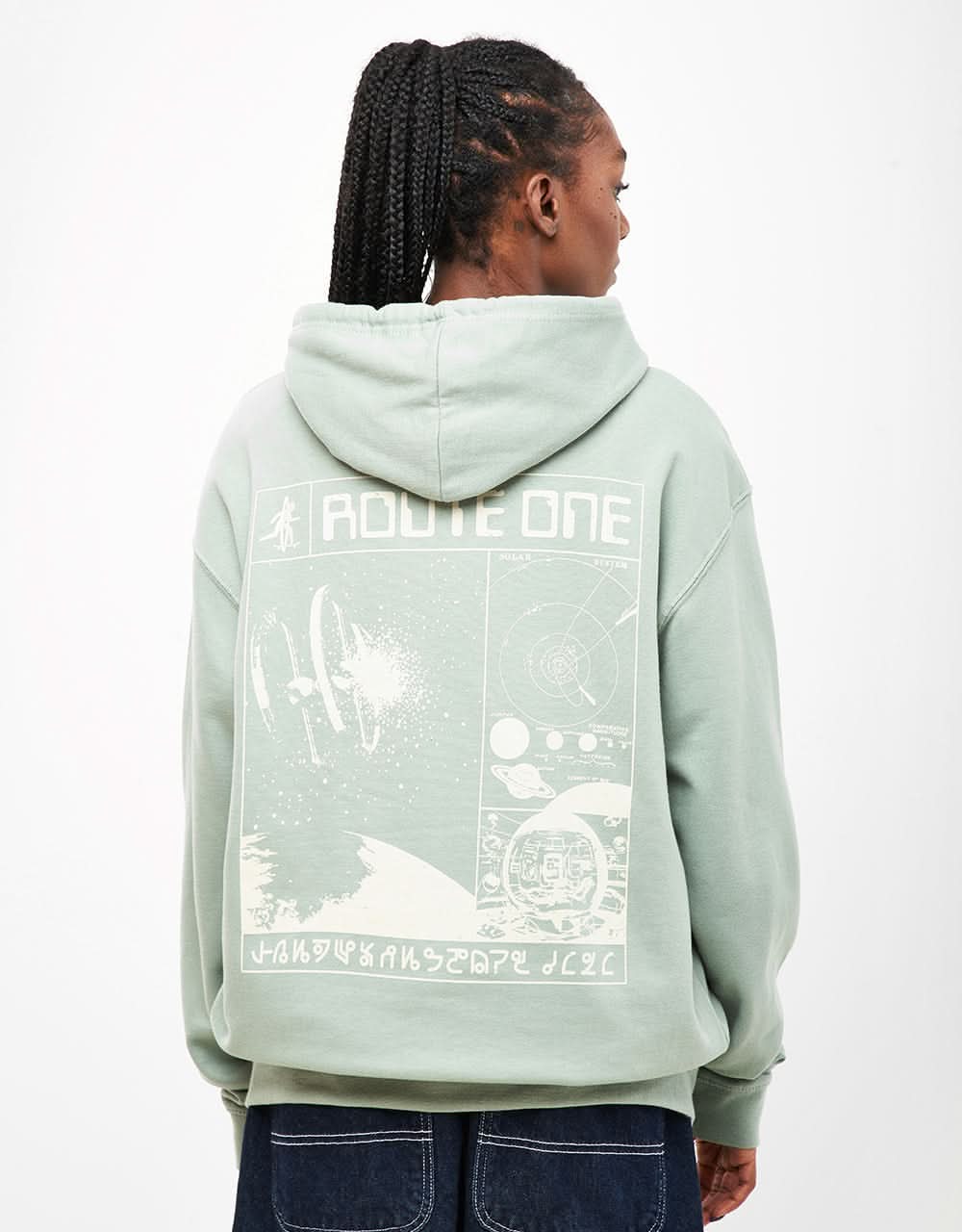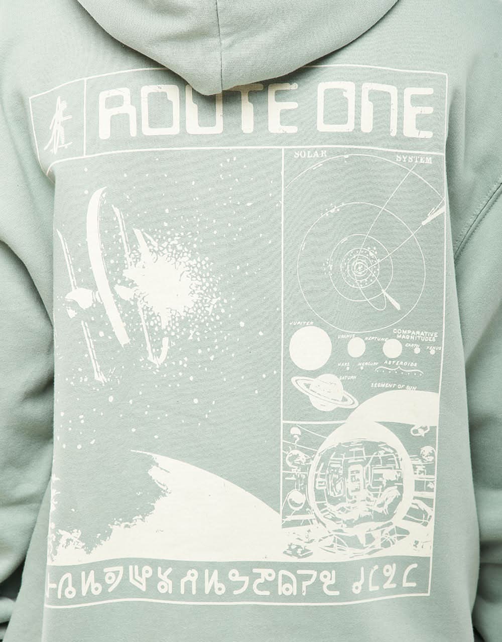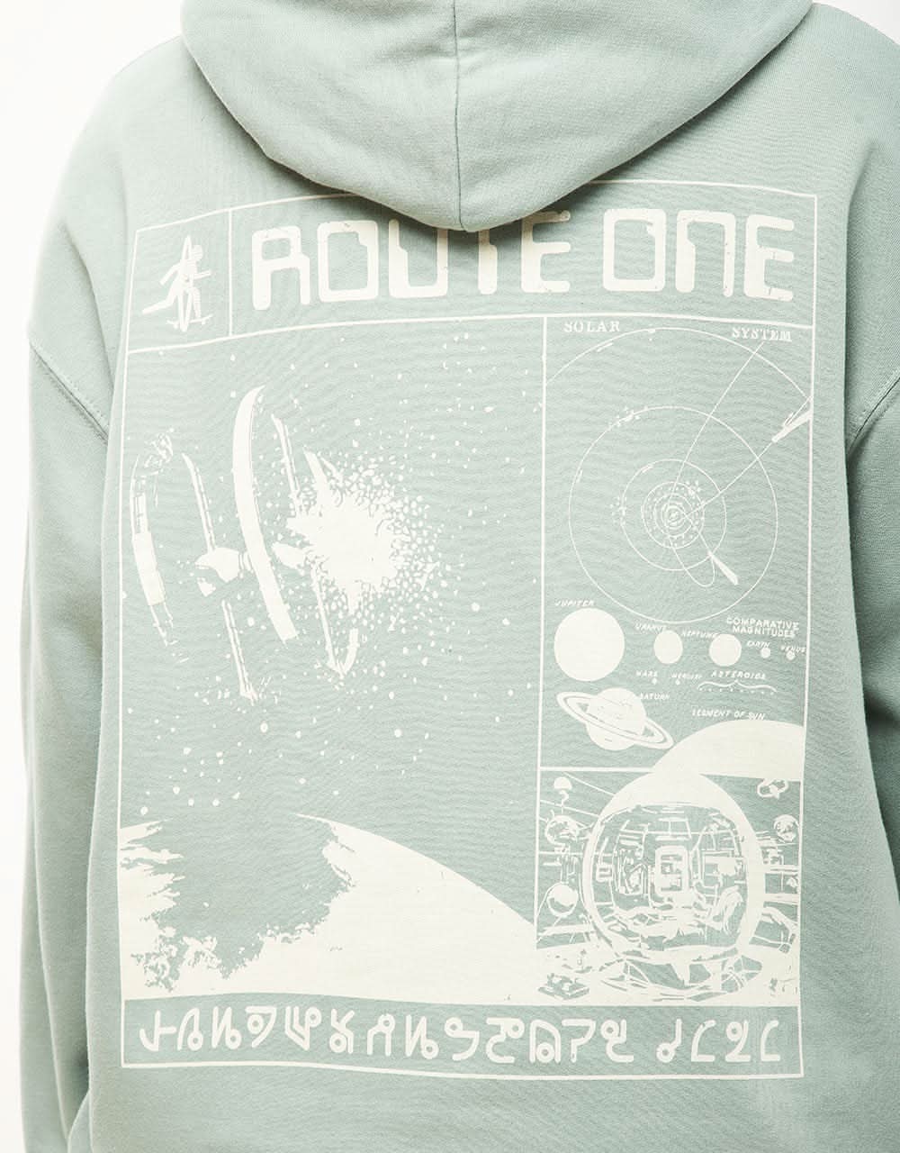 The Route One Final Frontier Pullover Hoodie in dusty green has been built from 100% cotton and features a comfy, slouchy hood, loose long sleeves and a printed neck label for itch-free comfort. Custom screen-printed illustrations have been placed at the centre front chest and in large across the reverse, designed in-house here at head office.