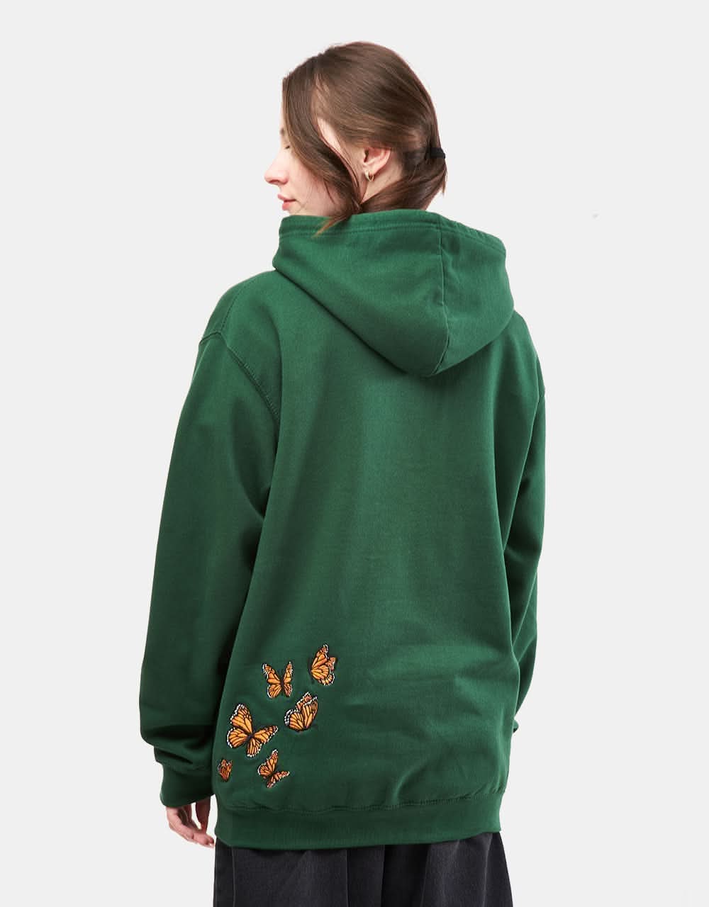 The Route One Flutter Pullover Hoodie in Bottle Green has been built from 100% cotton and features a comfy, slouchy hood, loose long sleeves and a printed neck label for itch-free comfort. Custom embroideries have been placed at the centre front chest and in large across the reverse, designed in-house here at head office.