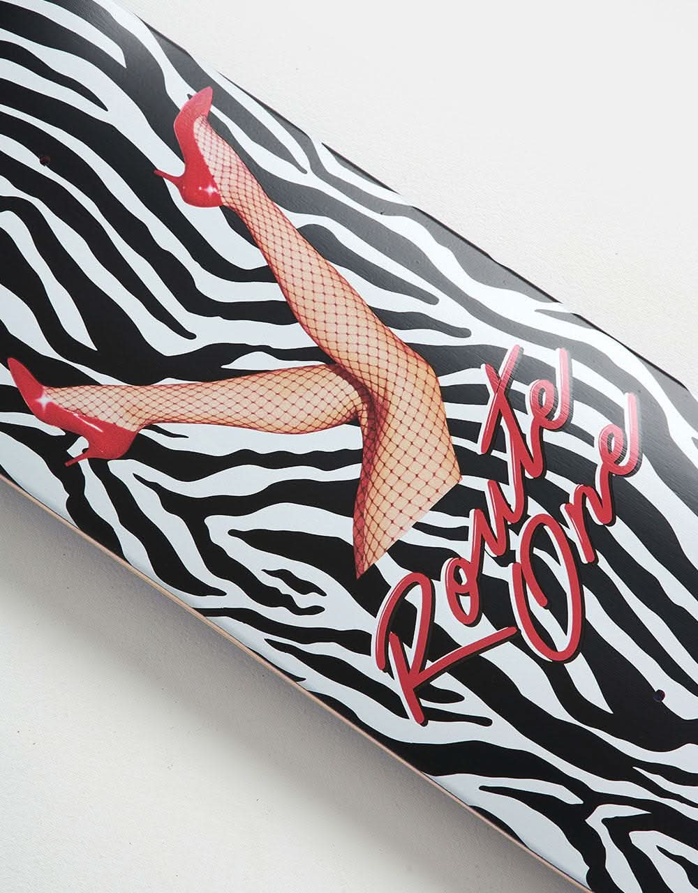 Our wonderful in-house designers have been hard at work and have delivered a whole load of fresh planks. The Route One Legs Skateboard Deck comes in at 8.375" wide and features a pair of legs and Route One branding in the centre on top of a zebra print background.