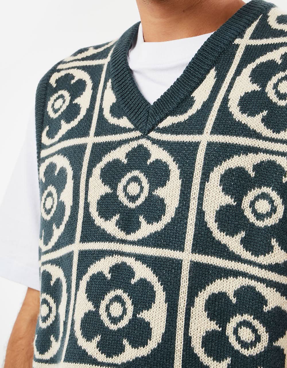 The Route One Majolica Knitted Vest is carefully crafted with a heavyweight Acrylic and Wool blend yarn and cut to a modern, slouchy fit that places itchy knitwear firmly in the past.
