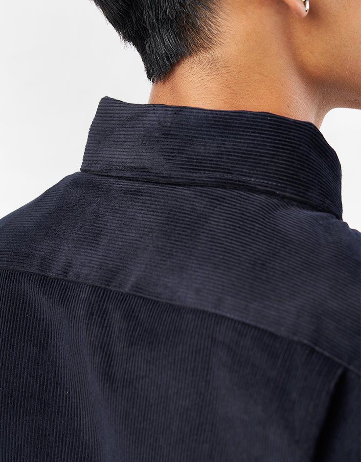 The Route One Moby Cord Shirt in Navy has been constructed from 100% cotton and features a full button placket, a classic cut collar with a concealed rouleau loop button fastening, and a small embroidered 'R' chest pocket. Wear it buttoned up or open with a tee beneath and rolled sleeves for a more relaxed look.
