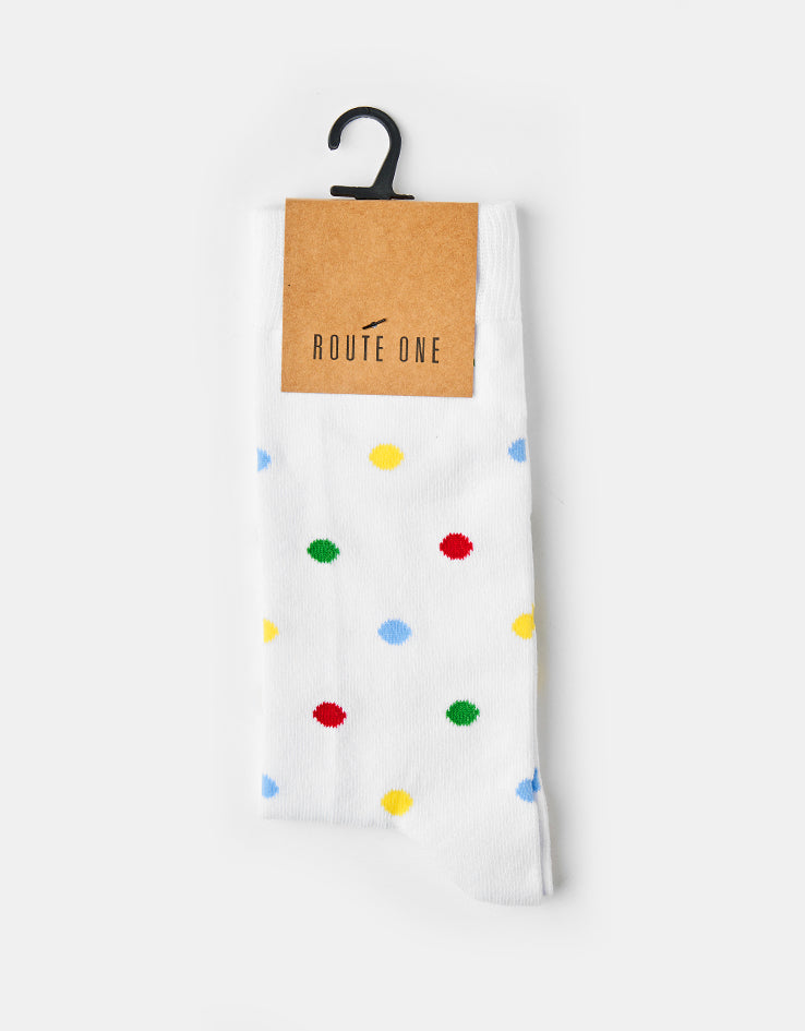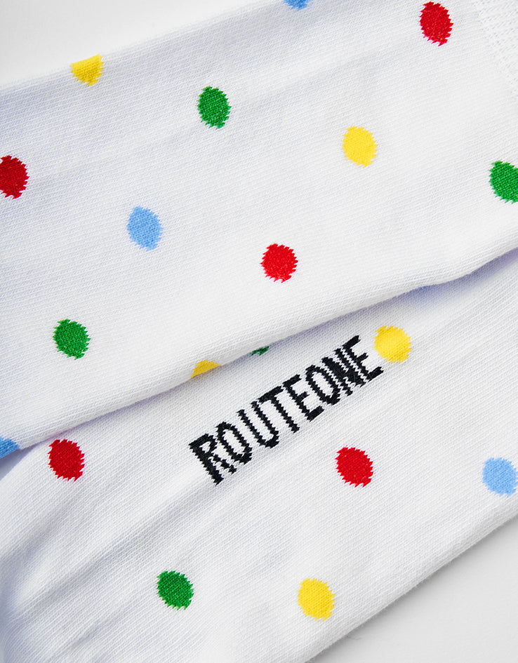 The Route One Polka Dot Socks in White have been constructed from a cotton/polyamide blend with touch of elastane to give them that extra comfort and subtle stretch. With an all over jacquard polka dot design, these will look sick poking out the bottom of your jeans! At such an affordable price, you really can't go wrong.