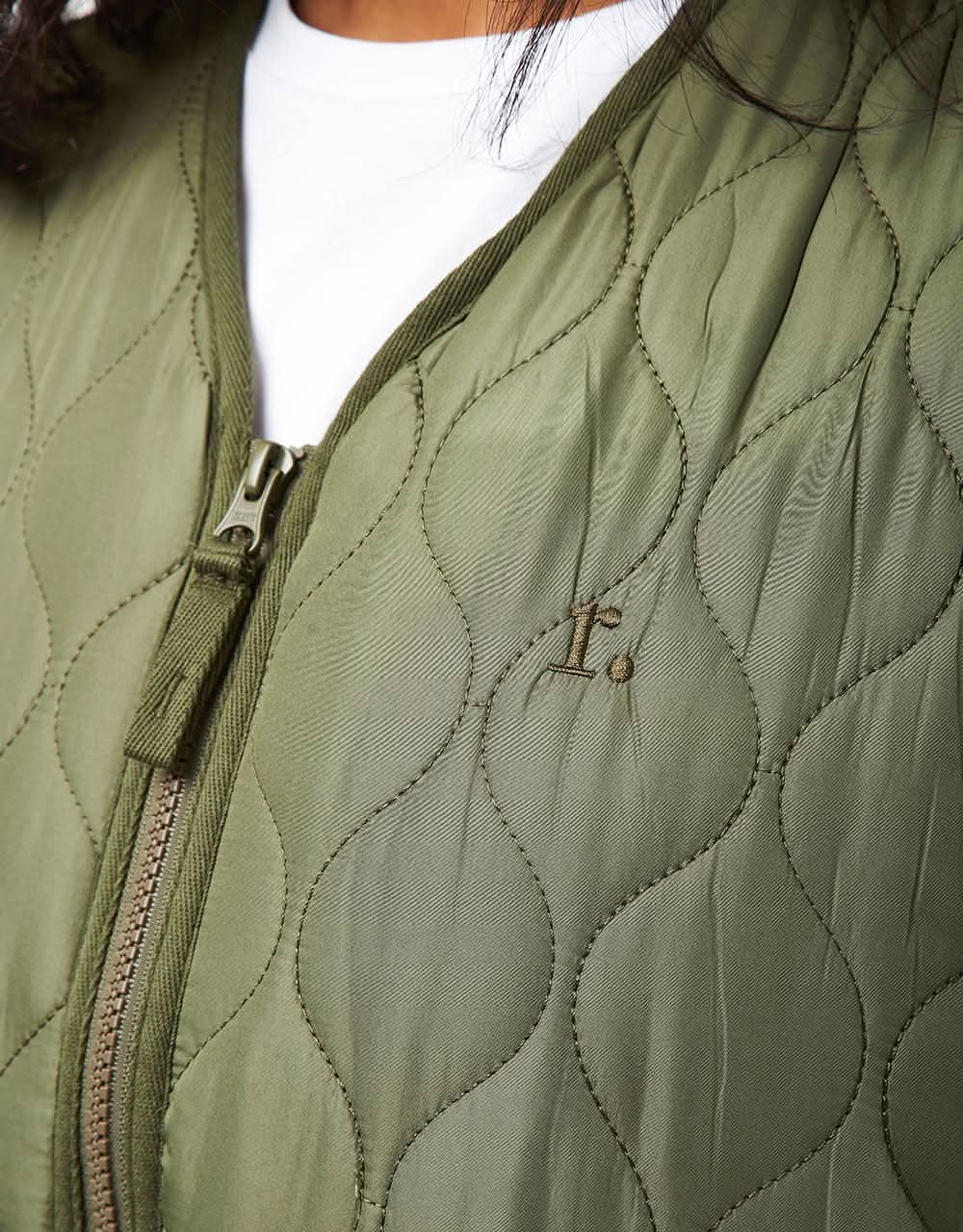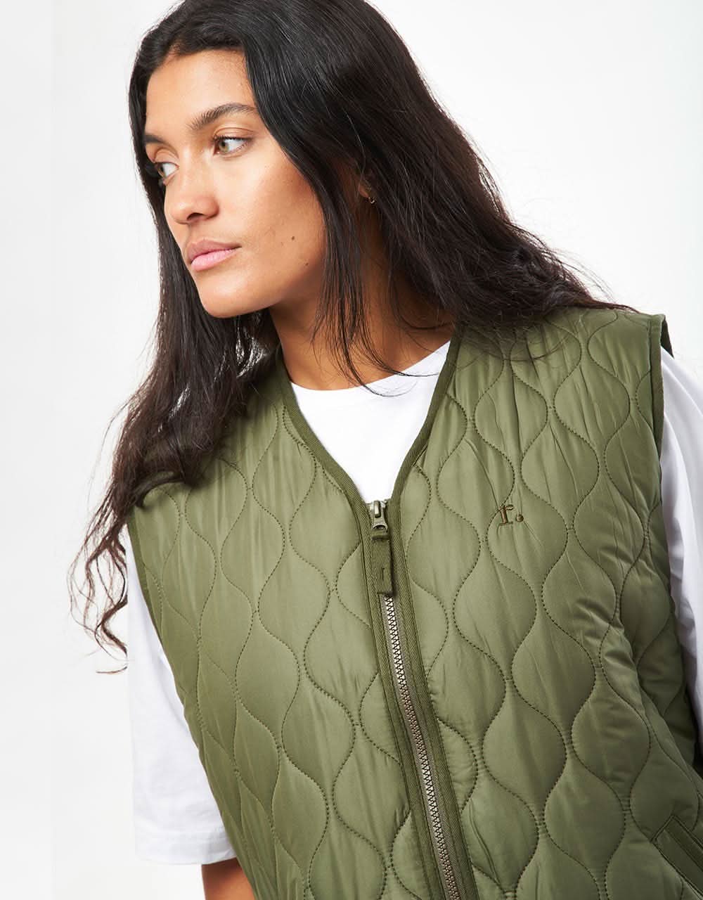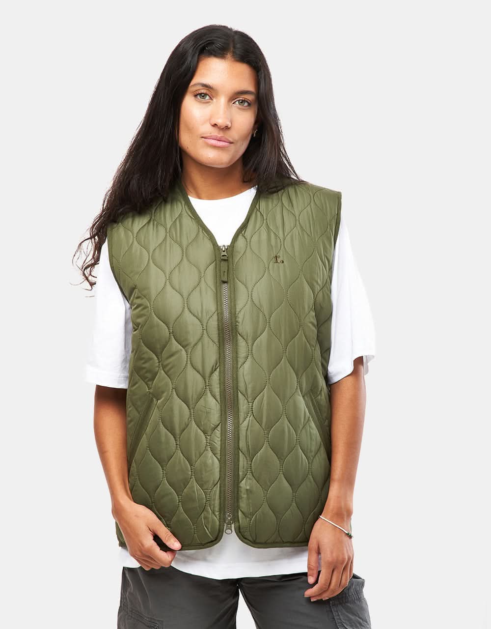 The Route One Quilted Liner in Olive is a polyester lightweight liner with a soft cream lining to keep you comfortable. Featuring a two way front zip and angled hand pockets lined with polar fleece.
