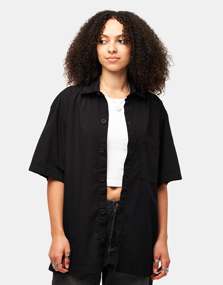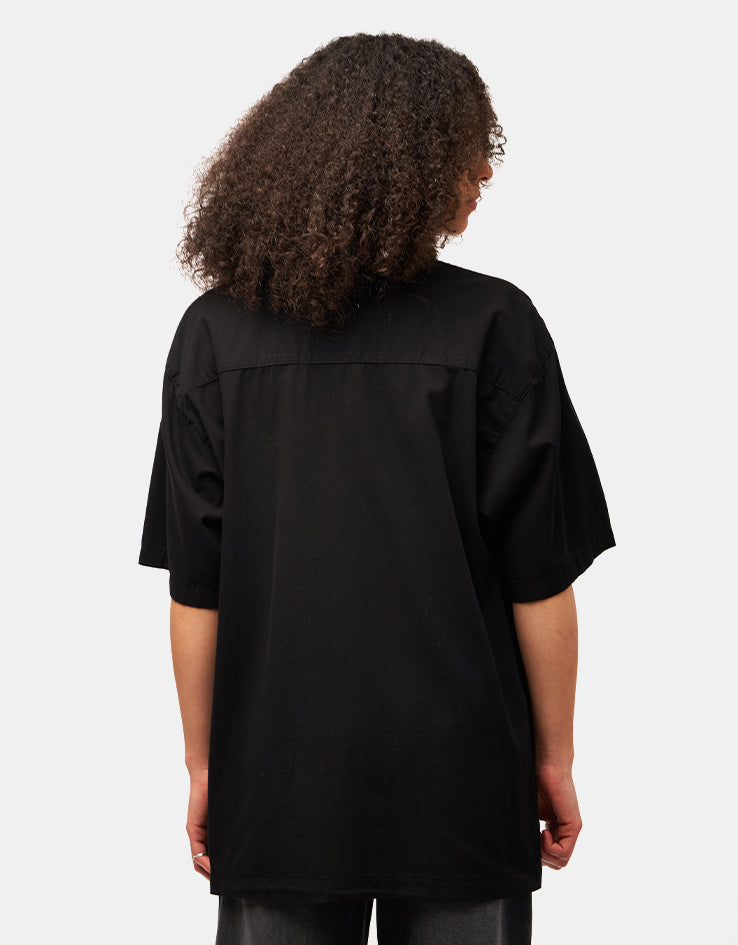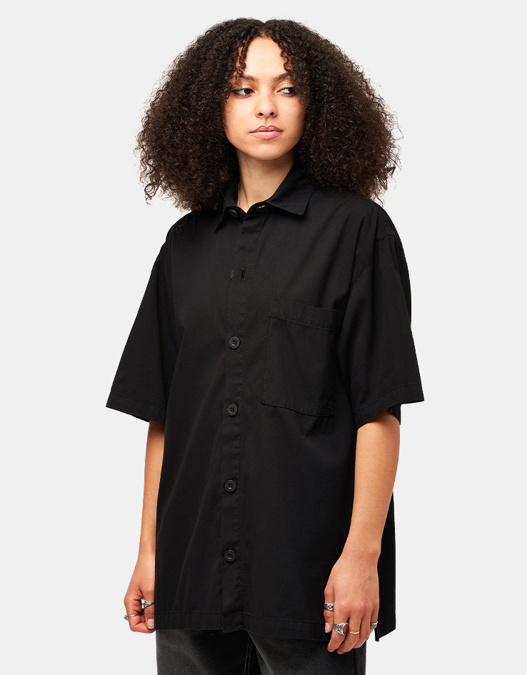 The Rowan Solid S/S Shirt in Black has been crafted from 100% cotton for a soft, breathable feel that’s ideal for the warmer months. Featuring a clean, solid colour design, this shirt offers a relaxed, boxy fit with a button-up front and classic collar. A versatile staple, it pairs effortlessly with our Super Baggy Shorts for a laid-back summer look.