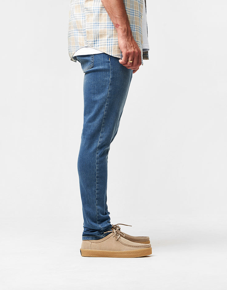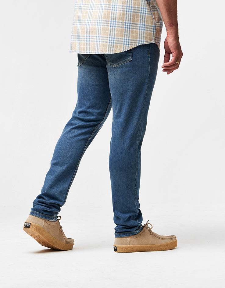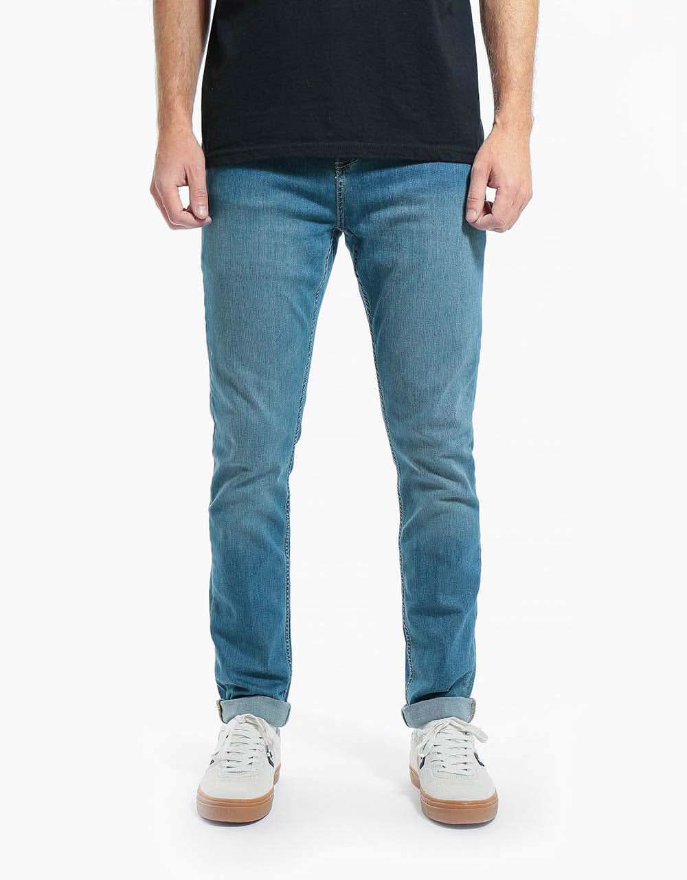 The Route One Skinny Denim Jeans in Washed Blue are true to size, but definitely size UP if you are inbetween sizes. They offer a thinner cut look, but due to the 2% elastane they have plenty of stretch so will still be comfy to wear. They feature the same locally sourced denim (from Europe) as the rest of our denim range, which is much softer to the touch yet still super strong. We've flattened the rivets to limit damage from slams and chain stitched the base of the seams for long lasting strength where they wear. And to finish it off our new denim got a new tonal, de-bossed, back patch.