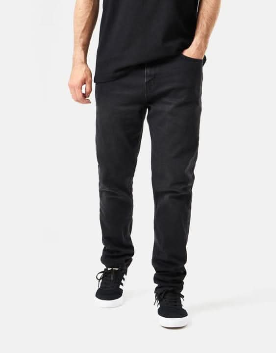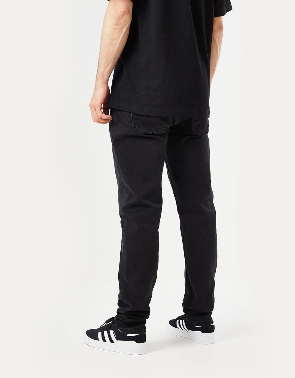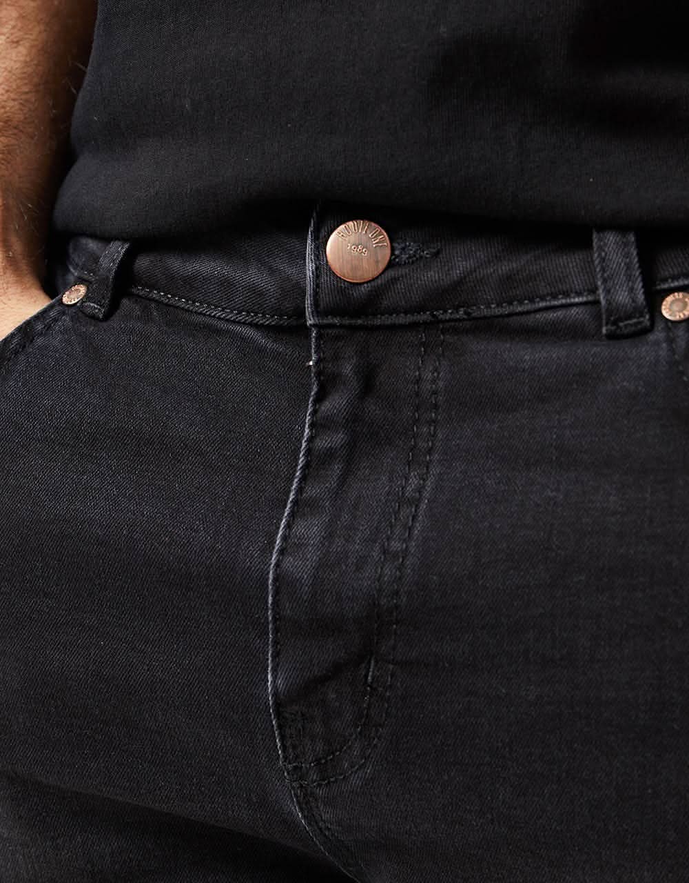 The Route One Slim Denim Jeans in Black fit true to size, so if you are on the cusp of two sizes, we suggesting choosing a size up. They offer a narrower knee to the relaxed, and sit perfectly on top of your shoe. With a tiny pinch of elastane, these will give the stretch retention and comfort you need, whilst still holding their shape. They feature the same locally sourced denim (from Europe) as the rest of our denim range, which is much softer to the touch yet still super strong. We've flattened the rivets to limit damage from slams and chain stitched the base of the seams for long lasting strength where they wear. A faux-leather debossed back patch finishes off the look.