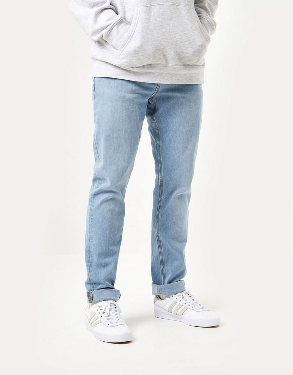 The Route One Slim Denim Jeans in Stone Wash fit true to size, so if you are on the cusp of two sizes, we suggesting choosing a size up. They offer a narrower knee to the relaxed, and sit perfectly on top of your shoe. With a tiny pinch of elastane, these will give the stretch retention and comfort you need, whilst still holding their shape. They feature the same locally sourced denim (from Europe) as the rest of our denim range, which is much softer to the touch yet still super strong. We've flattened the rivets to limit damage from slams and chain stitched the base of the seams for long-lasting strength where they wear. A faux-leather debossed back patch finishes off the look.