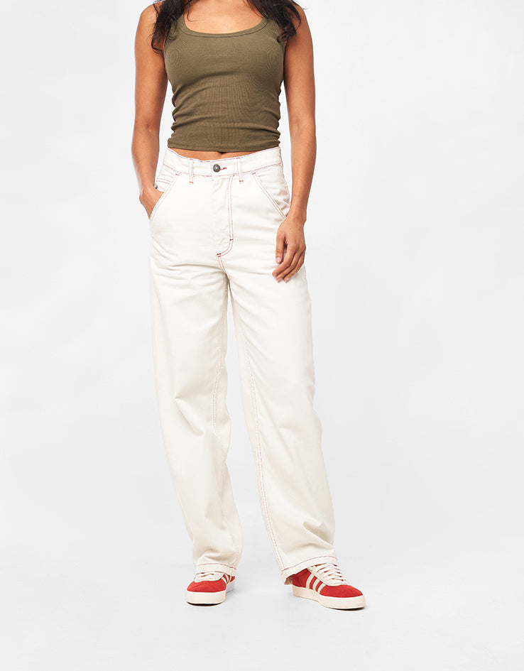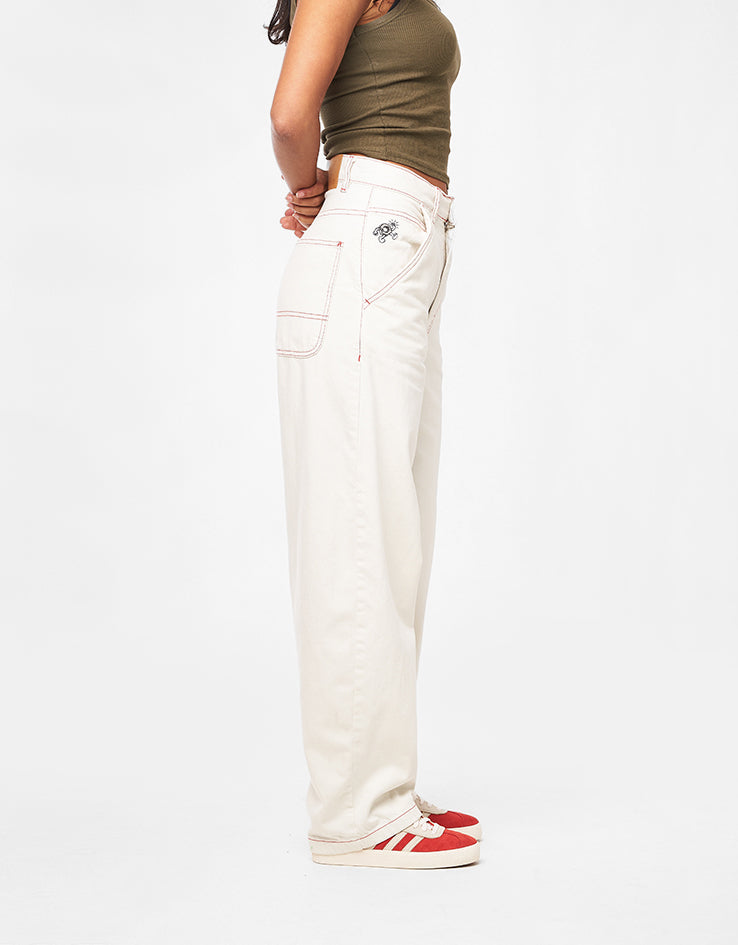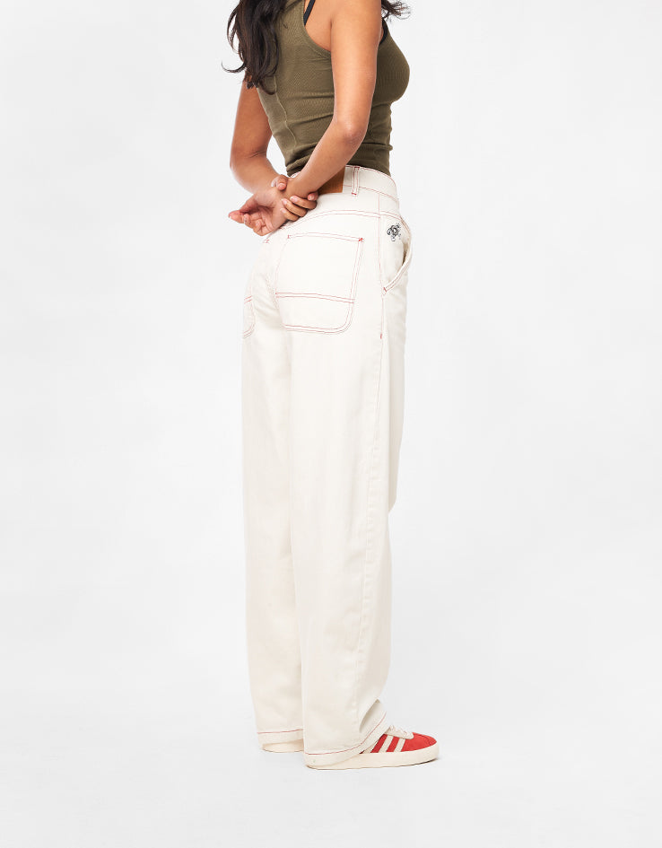 Our supersized ‘Super Baggy’ denim in Ivory Cream has a low crotch and voluminous leg offering an oversized fit with tapered hem to sit perfectly on your shoe. Constructed from our premium 100% Cotton 13oz denim, it is robust and heavy duty. Featuring wide belt loops, vegan leather patch, YKK zipper, branded button waist fastening and includes 5 pockets. Available in a standard leg and a short leg and in a variety of different washes.