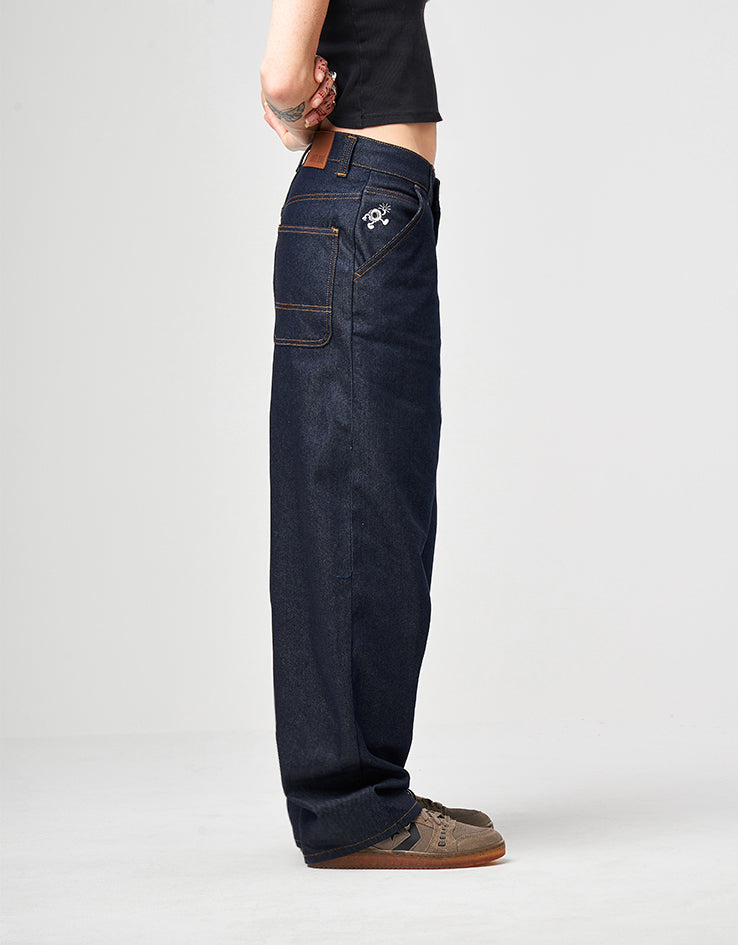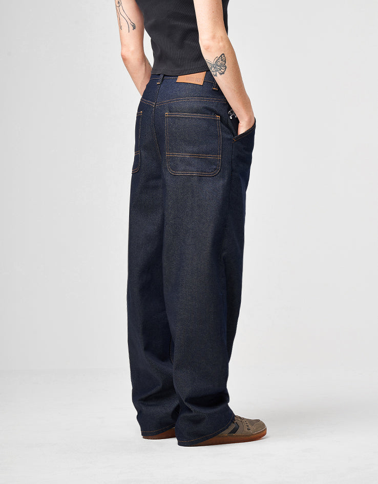 Our supersized ‘Super Baggy’ Raw denim has a low crotch and voluminous leg offering an oversized fit with a tapered hem to sit perfectly on your shoe. Constructed from our premium 100% Cotton 13oz denim, it is robust and heavy duty. Featuring wide belt loops, faux leather patch, YKK zipper, branded button waist fastening and includes 5 pockets. Available in a standard leg and a short leg and in a variety of different washes.