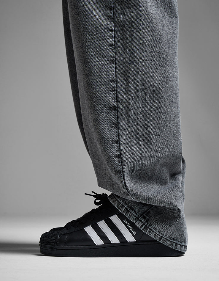Our supersized ‘Super Baggy’ Slate Grey denim has a low crotch and voluminous leg offering an oversized fit with a tapered hem to sit perfectly on your shoe. Constructed from our premium 100% Cotton 13oz denim, it is robust and heavy duty. Featuring wide belt loops, faux leather patch, YKK zipper, branded button waist fastening and includes 5 pockets. Available in a standard leg and a short leg and in a variety of different washes.