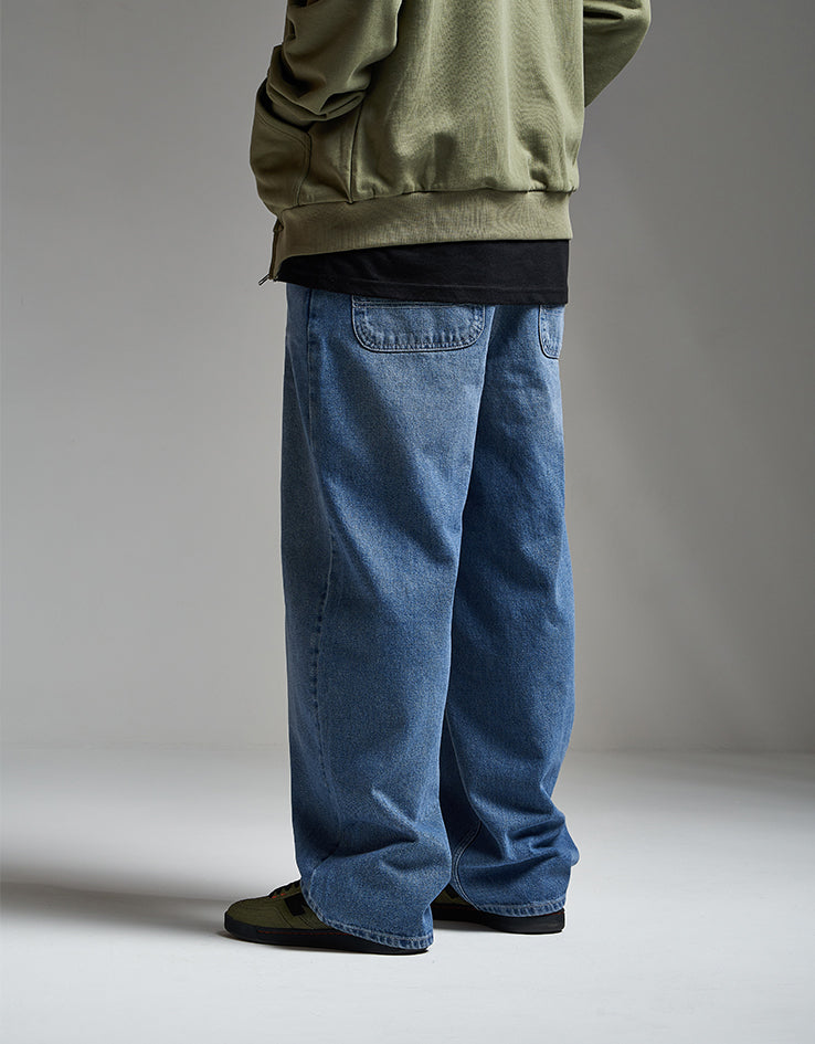 Our supersized ‘Super Baggy’ Washed Blue denim has a low crotch and voluminous leg offering an oversized fit with a tapered hem to sit perfectly on your shoe. Constructed from our premium 100% Cotton 13oz denim, it is robust and heavy duty. Featuring wide belt loops, faux leather patch, YKK zipper, branded button waist fastening and includes 5 pockets. Available in a variety of different washes.