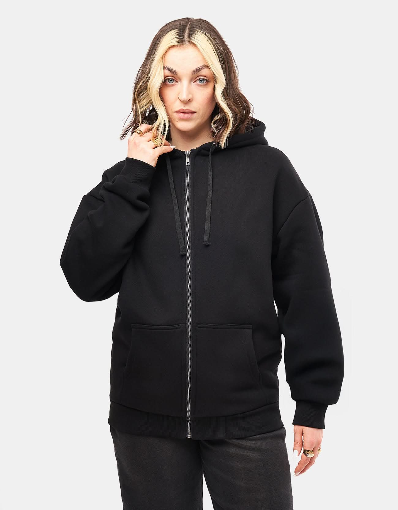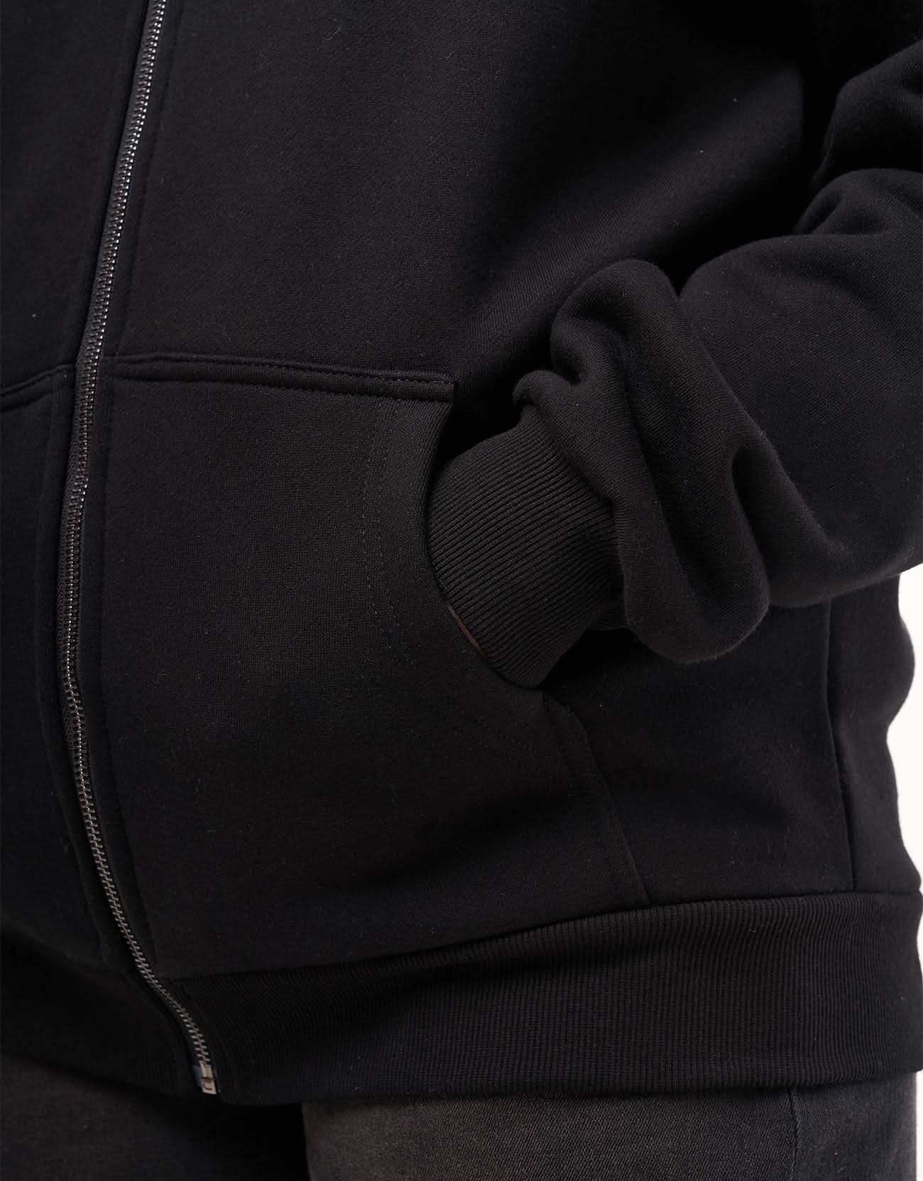 We are proud to introduce our new Heavyweight Zip Hoodie in Black. This hoodie follows a trendy, boxy fit and is constructed from a super soft brushed back fleece and comes in a relaxed style for maximum comfort. The hoodie features a large kangaroo pocket, and an adjustable hood. This is a perfect addition to your winter wardrobe and is ideal for layering.