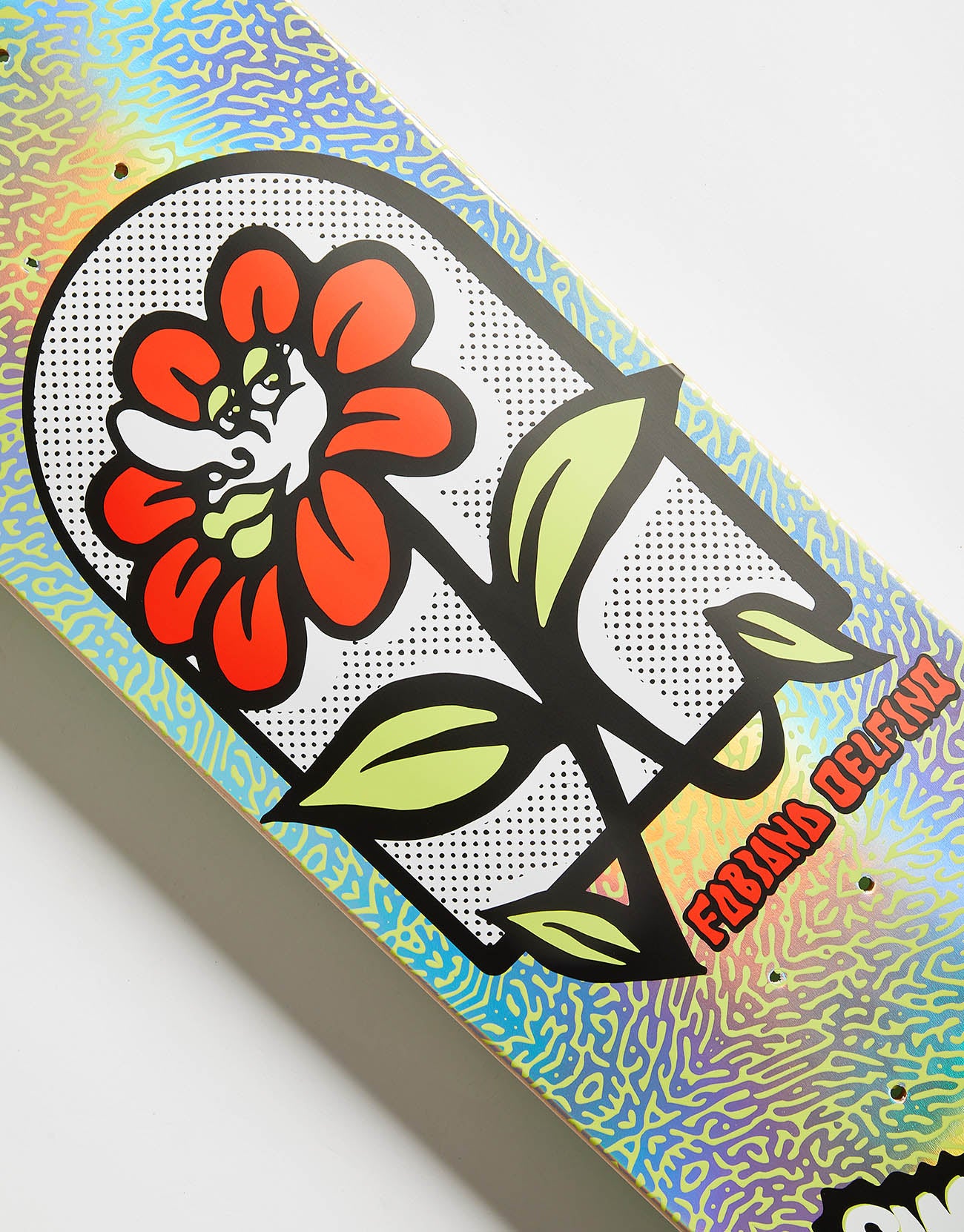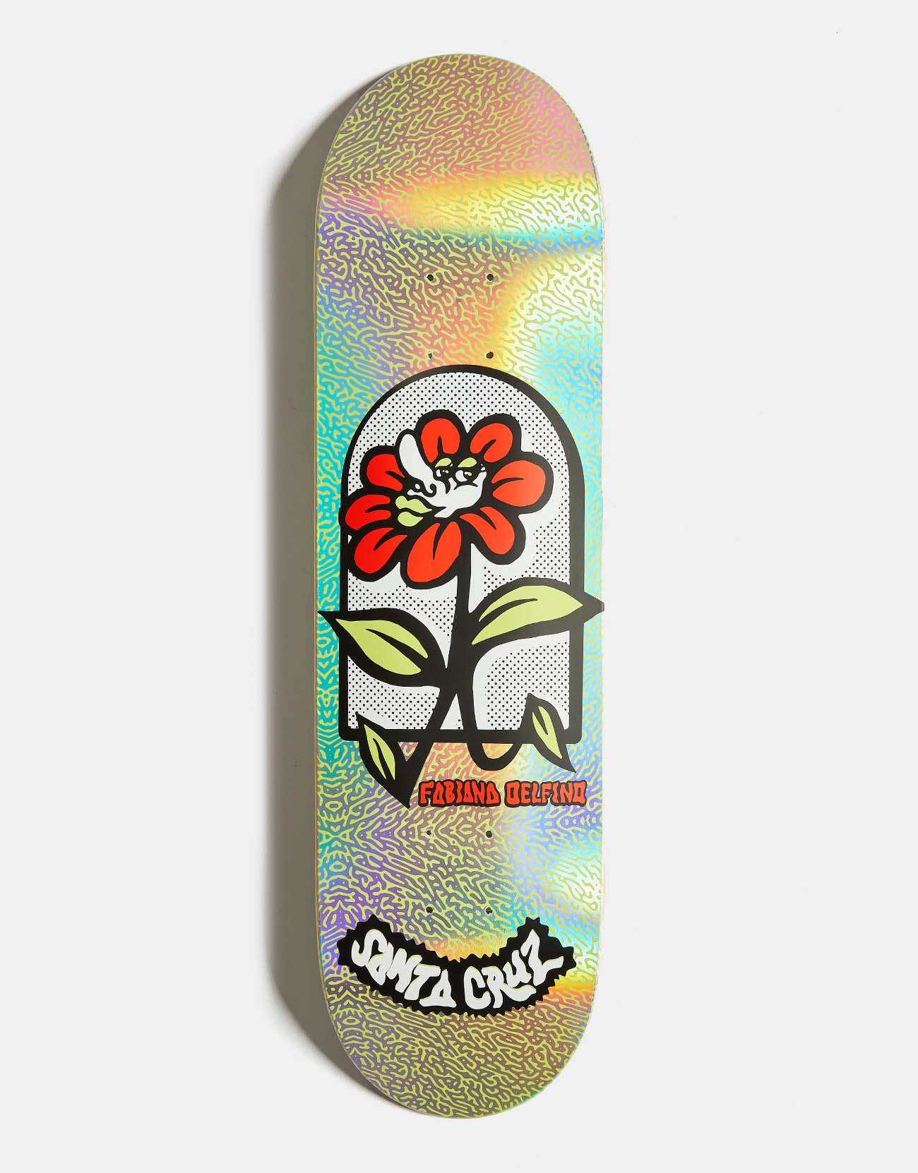 The Santa Cruz Delfino Flower Frame FeelBase Skateboard Deck is a pro model for Fabiana Delfino coming in at 8" wide with 13" wheelbase and spot matte and silver rainbow foil graphics.