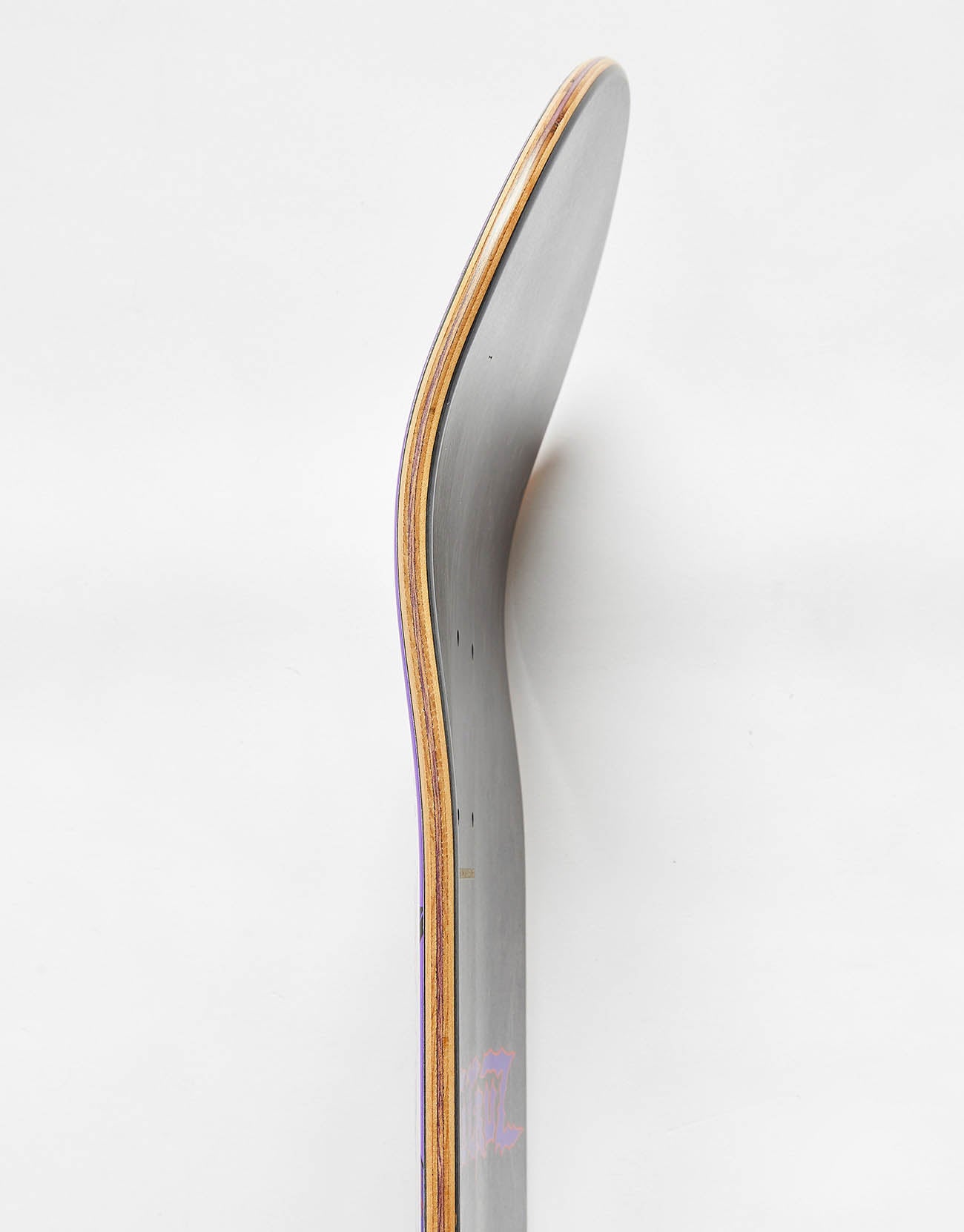 The Santa Cruz Pace Deathtrap Remix Skateboard Deck is a team board coming in at 8.7" wide. The deck features a skull graphic with spot gloss & raised ink graphics and violet metallic foil.