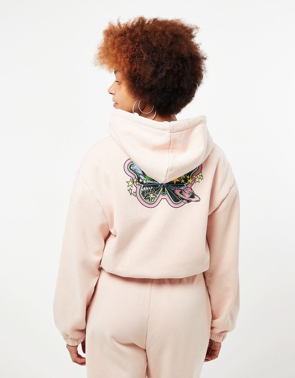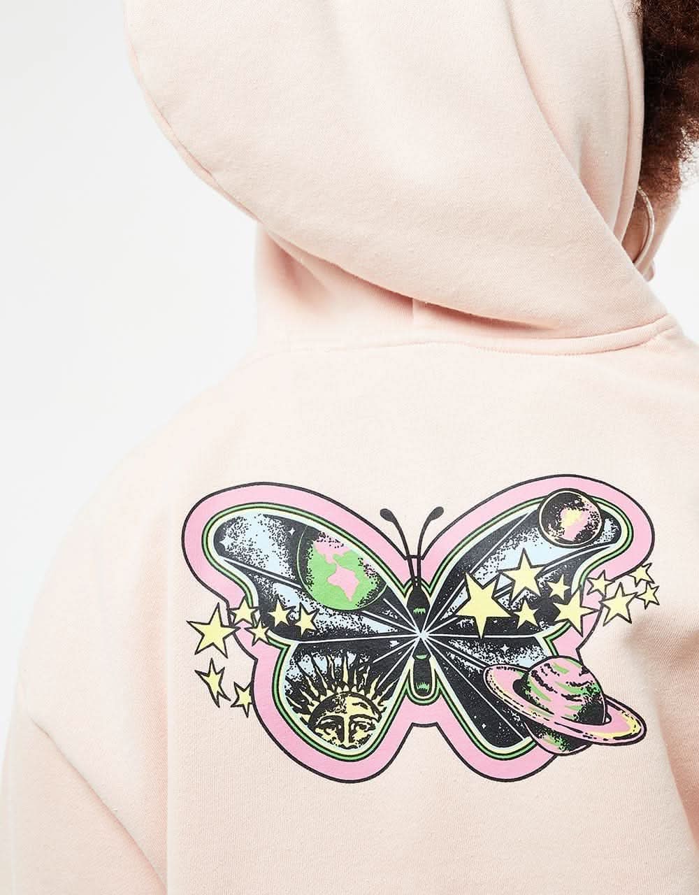 Made from a soft and durable cotton blend, this hood features a one-of-a-kind acid wash pattern in a neutral putty colour. The galactic-inspired butterfly back design adds a cool and cosmic vibe to the overall look.