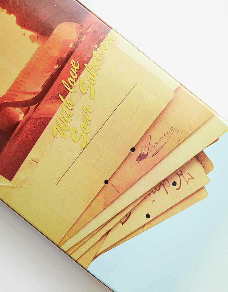 The Sour Greetings Skateboard Deck is a team board coming in at 8.125" wide. The deck  features a pile of vintage letters, with the top one showing a fire and 'Barcelona' over the top on a light blue background.