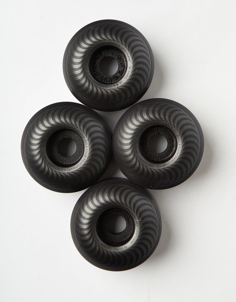 The black Spitfire Formula Four Classic 99d Skateboard Wheels set come in at 56mm with that sweet Formula Four urethane. The number 1 Spitfire shape, proven to give you the speed and control which you need.