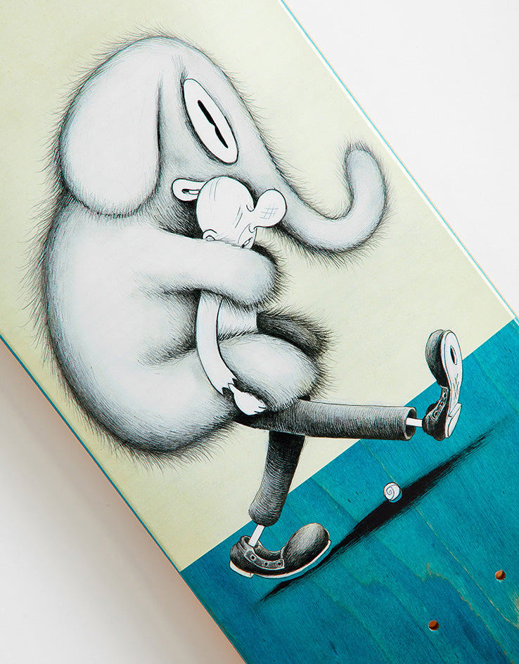 Ed Templeton’s Toy Machine have built their reputation on daring, humorous, and sometimes outrageous graphics since its inception in 1993. The Ladoucer series follows suit, featuring iconic pieces of artwork by Jeff Ladoucer in his trademark surrealist stylings. The Toy Machine Romero Ladouceur Series Skateboard Deck is a pro model for Leo Romero coming in at 8.38" wide. The deck features a solemn looking man carrying an equally solemn elephant on his back on a split off white and wood veneer background.