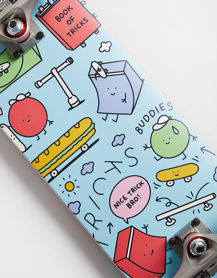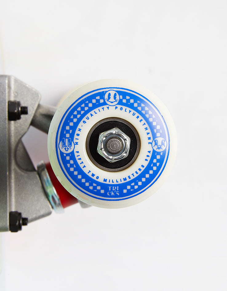 The Tricks Bad Fish Mid Complete Skateboard comes fully set up and ready to hit the streets. The deck comes in at 7.75" wide and is a MIDI board, which is perfect for smaller humans. The deck features a fish wearing a shark fin, on top of a blue background. It comes equipped with raw trucks and 52mm diameter wheels, making it perfect for those just starting out or any smaller skaters.