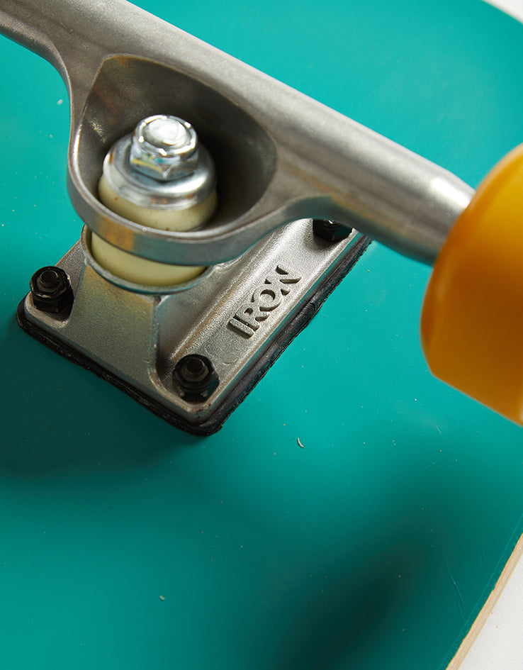 The Tricks Diplodocus 'Dino' Mini Complete Skateboard comes fully setup and ready to skate. The deck comes in at 8.25" wide and features a cartoon dinosaur sat down on top of a turquoise background and features a soft cork top that is more forgiving for younger skaters. It comes fully equipped with raw trucks and yellow Tricks wheels, making it the ideal board for smaller humans.