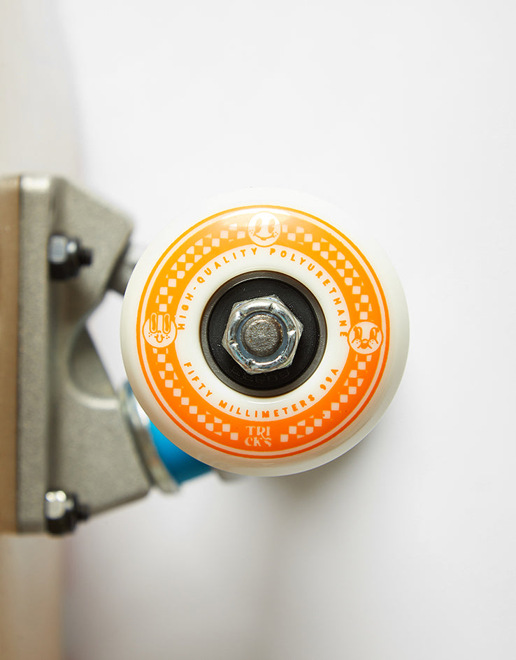 The Tricks Pizza Complete Skateboard comes fully set up and ready to hit the streets. The deck comes in at 7.75" wide and is a MAXI board. The deck features a personified slice of pizza with a checked border. It comes equipped with raw trucks and 52mm diameter wheels, making it perfect for those just starting out or anyone looking for an upgrade on their current setup.