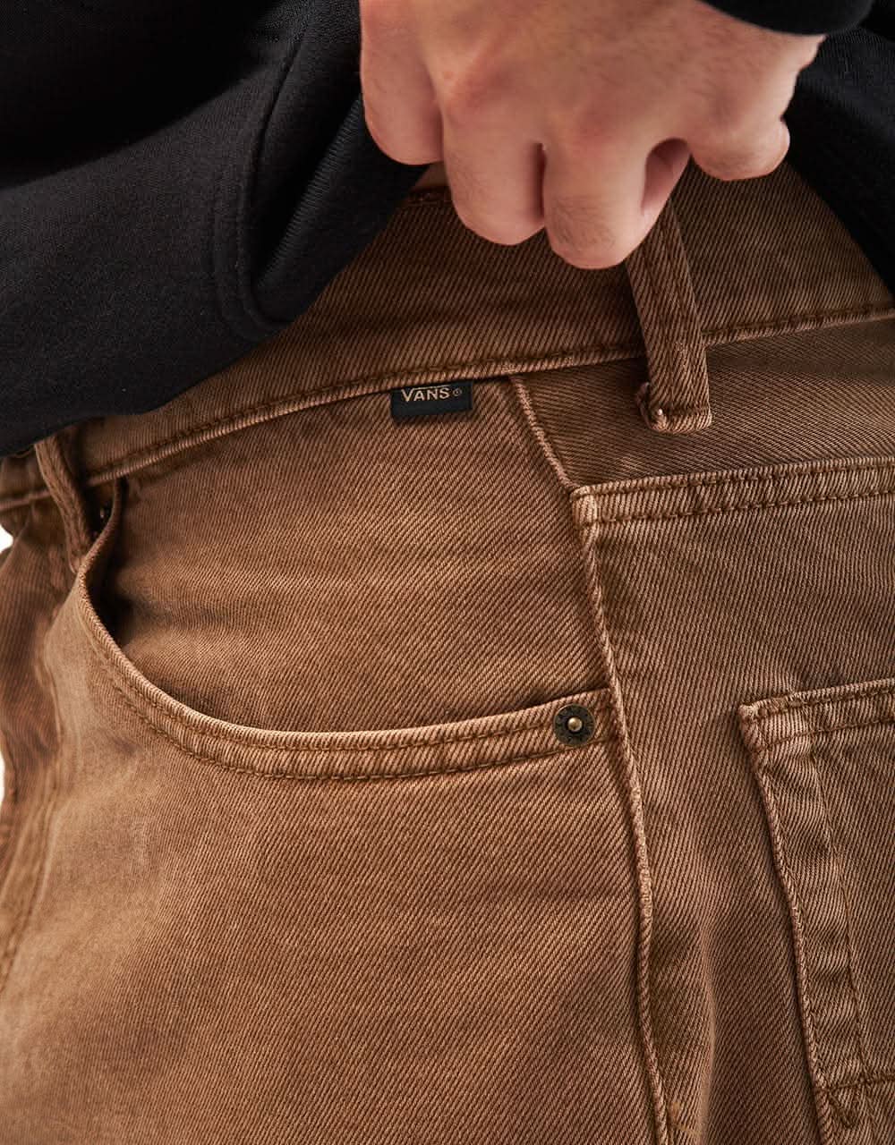 Upgrade your wardrobe with the Vans Loose Fit 5 Pocket Denim Pant in Sepia, providing style and comfort in a baggy fit. Composed of 100% cotton, featuring a zip fly and classic Vans branding on the waistband and front pocket. A timeless piece that is made to last.