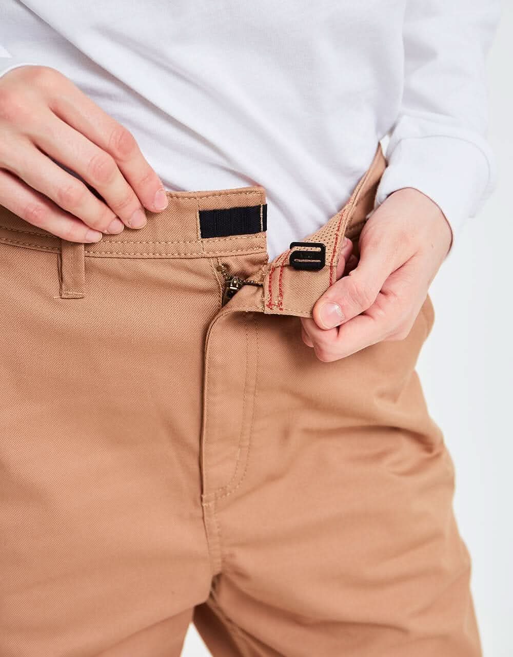 Made from 64% Polyester, 34% Cotton and 2% elastane, these chinos have a soft-to-touch handfeel, but have a heavy twill for durability. The trousers in a relaxed fit feature mesh vents at the back darts for breathability, front and back pockets and are high-waisted.